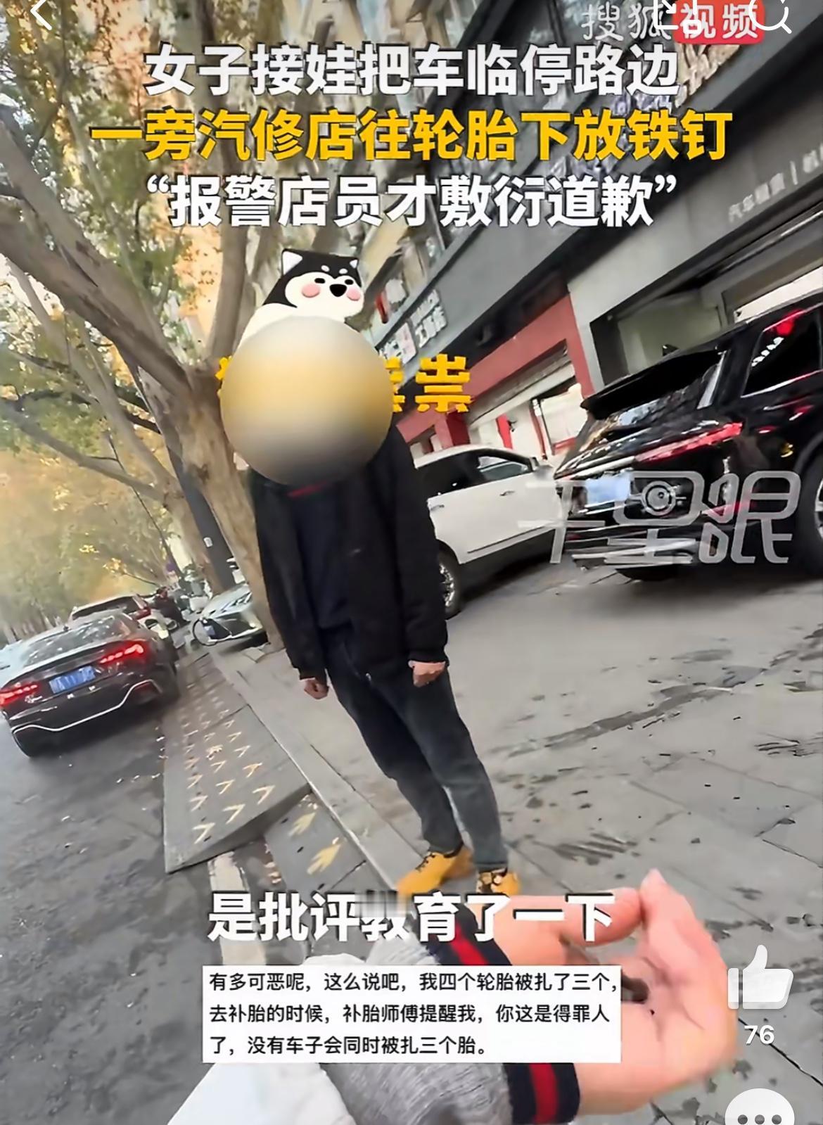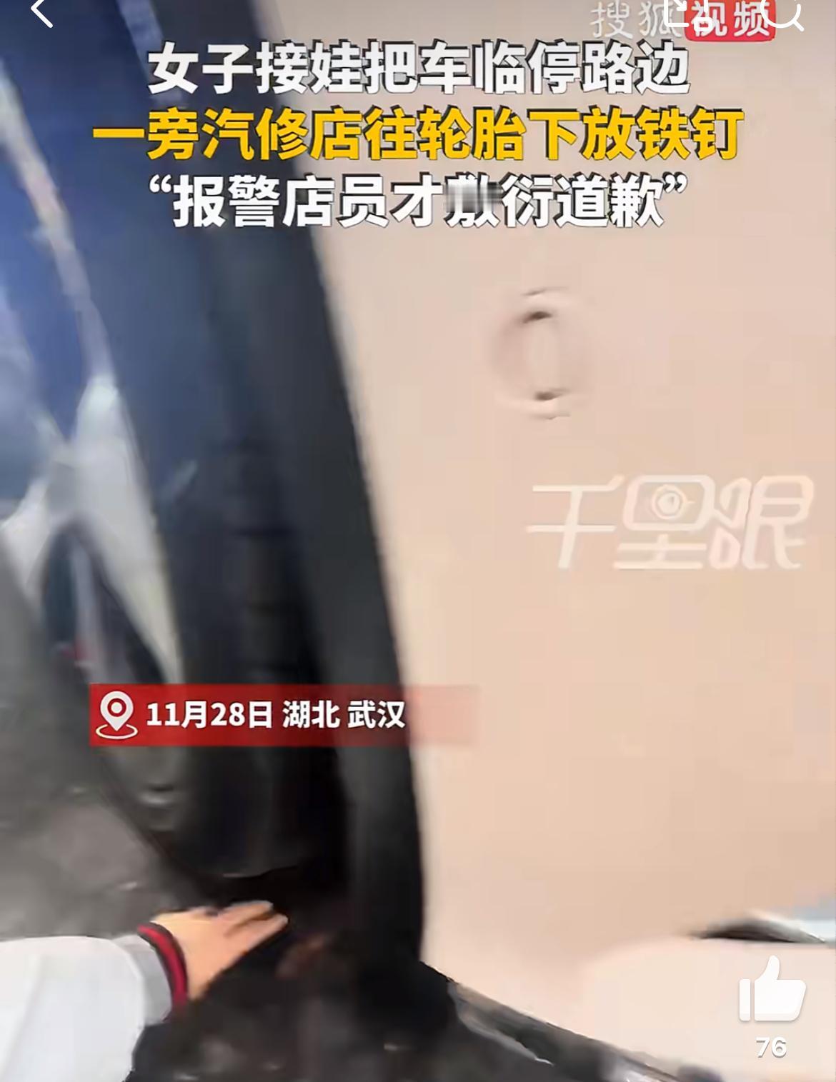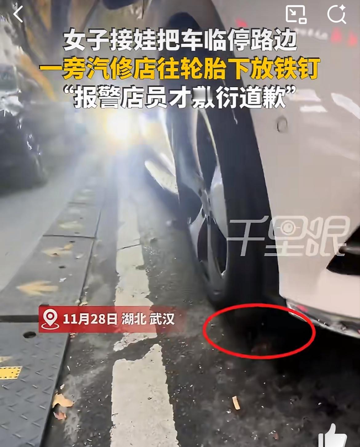 武汉女子把车停在一汽修店门口,轮胎底下被放钉子,这个新闻被引导到汽修店动机不纯,想讹诈这车主,其实不是。女滴接孩子放学,找不到停车位,恰好发现汽修店门口有个空,以为运气好,就停进去了,可是却没发现这是人家的进车口,挡住人家做生意了。并且人家汽修店还打电话给她挪车了,显然她没有按照规定时间赶过来,汽修店才这样干的,虽然有点不地道。汽车轮胎被扎 轮胎钉子 砸车女子