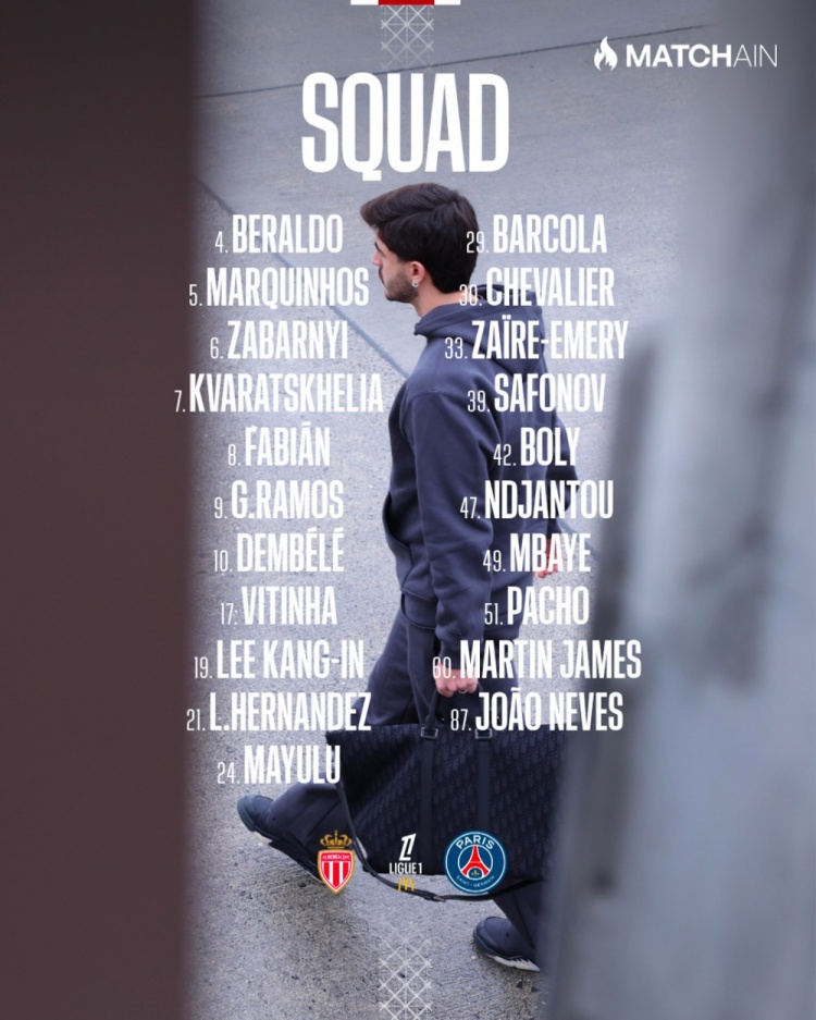 直播吧11月29日讯北京时间明天凌晨,巴黎将在法甲第14轮比赛中客场对阵摩纳哥,巴黎公布了此役的球员名单。阿什拉夫、杜埃、努诺·门德斯缺席