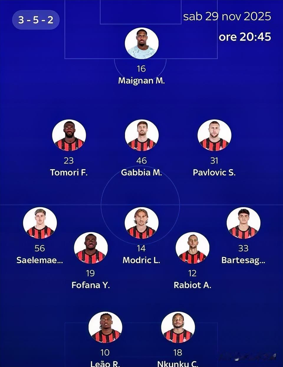 米兰与拉齐奥之战首发阵容!米兰对普利西奇的评估为无法参加比赛,恩昆库将顶替普利西奇出任首发前锋,同时最近一直表现出色的小将巴特萨吉将继续首发出战。期待我们的巴特萨吉能有稳定发挥,不求有功,但求无过。 米兰首发阵容为3-5-2: 守门员:迈尼昂 后卫:托莫里、加比亚、帕夫洛维奇; 中场:萨勒马克尔斯、福法纳、莫德里奇、拉比奥特、巴特萨吉 锋线:恩昆库、莱奥 恩昆库的机会来了,之前都是零碎的时间,本场比赛首发出战,又是自己熟悉的边锋位置,不求进球,但求能让我们看到希望,肋部突击和带球推进是不是能展现一下。 另外之前被阿莱格里欣赏的巴伦蒂恩不知道出了什么问题,之前如果锋线没有替补球员巴伦蒂恩就会入选一线队,但最近米兰一线队训练场都没有看到巴伦蒂恩的身影。