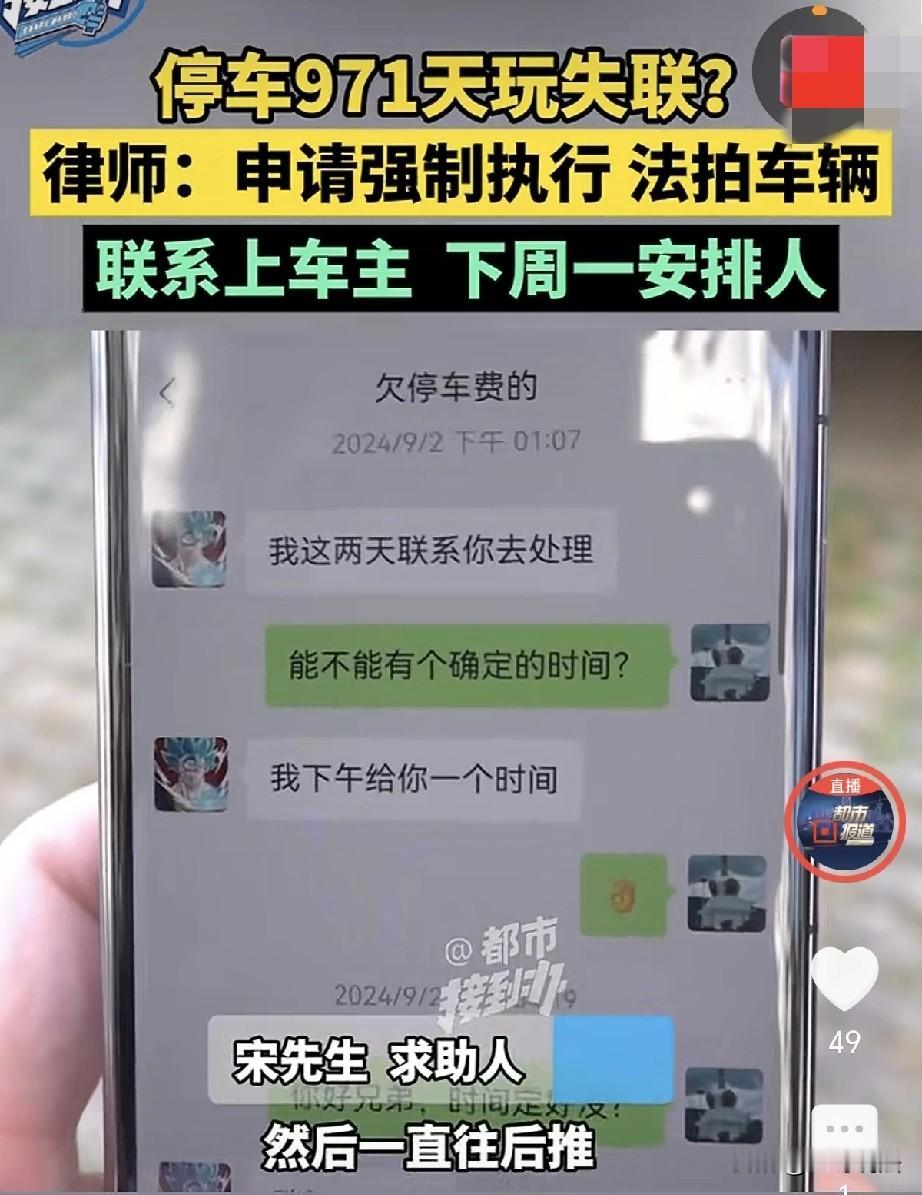 河南郑州,一停车场老板发现,一辆车停了971天,停车费39847元,老板联系车主,车主电话不接,V信不回,老板换了6个电话,还是打不通对方电话,老板报警,可警方回复,这是经营停车场,没有占道,交警无法拖车,车主忍无可忍,就是把车赔他,车都不值5000块钱,老板想把车给砸了,又怕车主回来讹他,老板进退两难…… 宋先生是一家停车场的负责人,他的停车场内,长期停放着一辆轿车。 轿车上布满了灰尘,树上的落叶,散落在车窗前面,一看就是长期无人问津。 宋先生查看了停车的日期,这辆车是在2023年3月30号14:29分开进了停车场内,至今为止,停了971天。 在这期间,停车费已经累计到了39847元,可宋先生始终没有看见车主露面。 起初那一个月,宋先生见无人前来取车,他就生出了疑虑,他按照车辆上的号码,打通过一次车主的电话。 对方是一位男子,俩人相互加上了V信,一开始对方态度尚可,说他人在外地,暂时不方便回来取车。 之后又过了很久,宋先生给他发去消息,要求对方赶紧把车开走。 车辆长期停在这里,你既不回来缴费,又要占用我一个车位。 长此以往下去,我这小本经营,经不起你这样欠费,希望你尽快回来,赶快把你的车开到别的地方。 车主接到消息,一开始还给宋先生回复,说他周一回来挪车,可到了周一,也没见人。 他又回复,到周四再来,可到了周四,依旧没见人来。 车主就这样敷衍,今天推明,明天推后,到了最后,他干脆不再回复宋先生的消息。 宋先生急了,这算是个怎么回事? 宋先生给他打去电话,可是电话明明已经接通,对方就是不接,宋先生毫无办法。 从此以后,宋先生白天也打,晚上也打,对方电话正常,就是显示无人接听。 宋先生以为,对方应该是故意不接自己的号码,于是他就换号,一直换了6个号码,可对方依旧不接,宋先生实在没了办法。 随着时间的推移,这辆车彻底变成了一辆疆 尸车,车身上不仅落满了灰尘,还沾了不少杂物。 车门把手处的灰尘都能划出痕迹,远远看去,就像一堆没人要的废铁。 停车费一天天累积,从最初的几百块钱,慢慢涨到几千块、一万块,直到现在,971天下来,算下来足足欠了39847元。 这可不是一笔小数目,宋先生看着欠费清单,手指都在微微发抖。 他经营这个小停车场本就不容易,场地租金、人工成本压得他喘不过气。 一个车位被这样长期占着,不仅收不到一分钱,还少了一个可用的车位。 就这样日复一日,年复一年,直接影响到了他了生意,更让宋先生糟心的是,这辆车现在就值5000元,就算把车卖了,也抵不上欠下的停车费零头。 朋友看他发愁,劝他不行把车拖走,找个地方先搁置起来。 可宋先生发愁,能往哪停,停到哪里都要收费,他是个诚实之人,总不能把车停到别人家的停车场去。 宋先生无奈之下,选择了报警处理,可交 警表示,车辆停放在经营停车场,没有占道,他们没有权力拖车。 宋先生思来想去,他请来了记者,希望记者能帮助自己,记者赶到现场,发现正如宋先生说的那样。 车辆上厚厚的灰尘,宋先生拍了一下: 我恨不得把车给他砸了!可是,宋先生又怕,砸车容易,砸完之后,车主回来讹他! 车主如今,进退两难,即便车主把车赔他,也不解决问题,这车也就价值5000元的样子, 记者用自己的号码拨了过去,对方还是不接电话。 宋先生表示,如果是车主去世了,确定是人不在了,车在这里停了三年,我免费要他把车开走。 如果是人进去了,在我这里停了三年,我还是会免费要他把车开走。 可恨的就是,他明明电话一直保持着畅通的状态,就是不接电话,信息不回,不解决问题,这人太可恨了! 宋先生就奇怪了,难道这车,车主就不要了吗?就这样天天搁在这里,难道就没办法了吗? 《民法典》第235条规定: 无权占有不动产或者动产的,权利人可以请求返还原物。 《民法典》第238条规定: 侵害物权,造成权利人损害的,权利人可以依法请求损害赔偿,也可以依法请求承担其他民事责任。 宋先生对停车场车位享有合法经营权,车主通过停车行为与宋先生形成事实上的保管使用关系。 可是车主却长期占用车位,拖欠费用,属于无权占有,宋先生催他挪车,车主多次承诺挪车却反复违约。 后续车主拒接电话、不回消息,造成宋先生车位收益损失和经营困扰,已构成对宋先生物权的侵害。 宋先生有权要求车主返还车位、支付累计停车费39847元,即便车辆价值低于欠费,仍可就差额部分主张赔偿。 若法院判决车主支付停车费并挪车,车主仍拒不执行,宋先生可通过申请法院强制执行。 法院可先拍卖车主车辆抵扣部分费用,若不足以清偿欠费,法院将依法冻结、划扣车主名下存款,或处置其名下其他可执行财产。 之后,在记者的坚持下,终于打通了车主的电话,对方答应派人来处理。 宋先生表示,如果这次再不处理,他就要向法院提起诉讼。