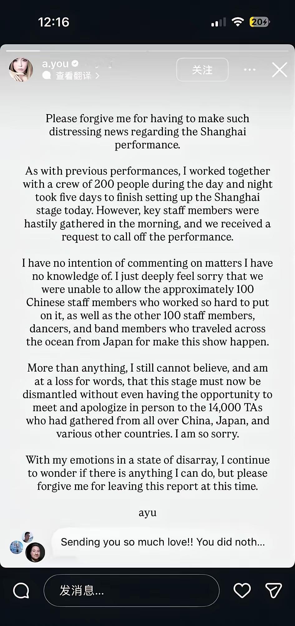 日本滨崎步在上海演出叫停后,用英文表达了心声。 但是通篇只表达了对工作人员的愧疚之情。 那么,前阵时间,同样是日本的女演员,美依礼芽公开发声支持一个中国时,她在干啥?! 所以,只想到中国捞金。关键的时候缺席的这些艺人,不单她,演出全部叫停,一点都不冤!