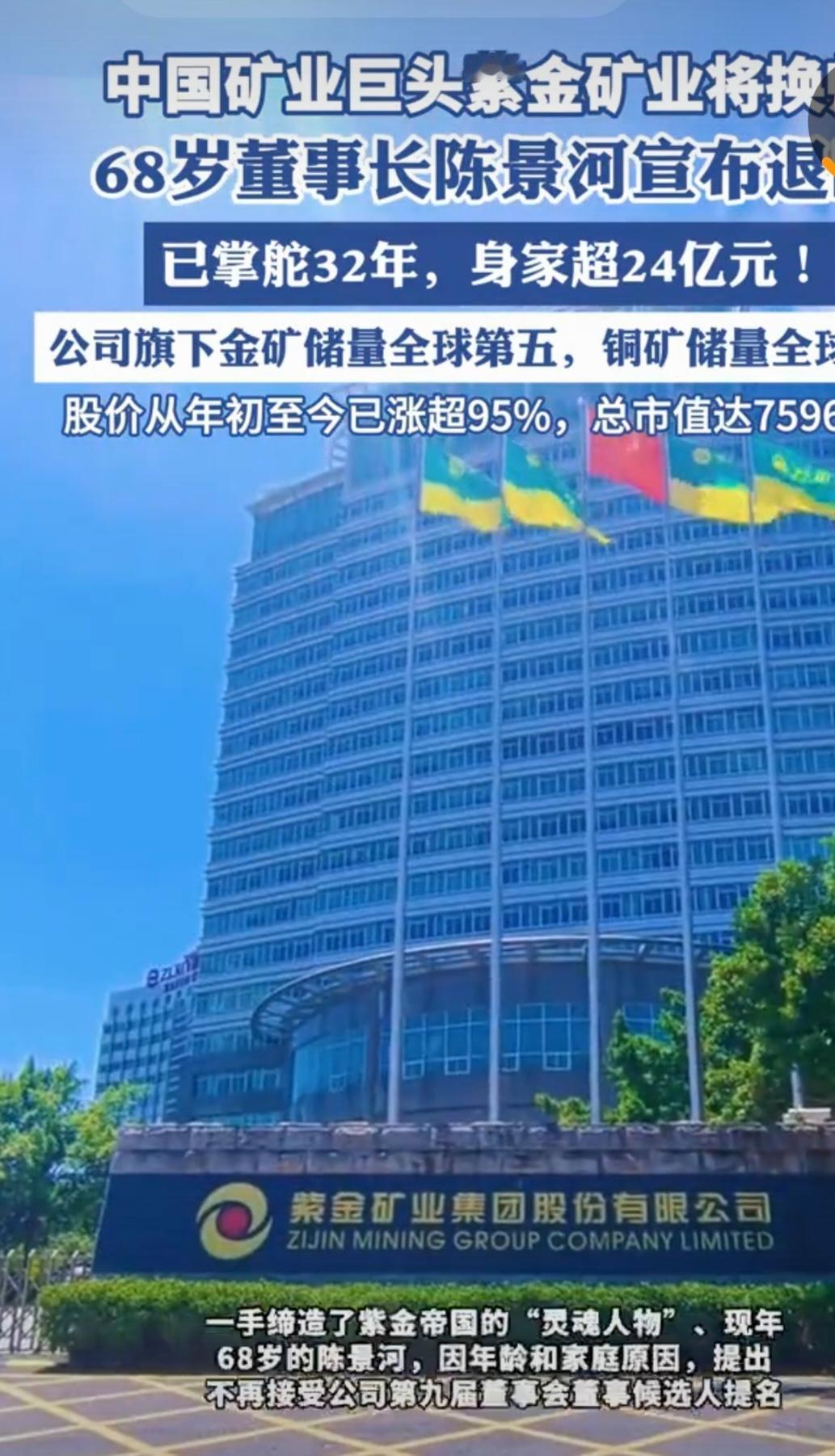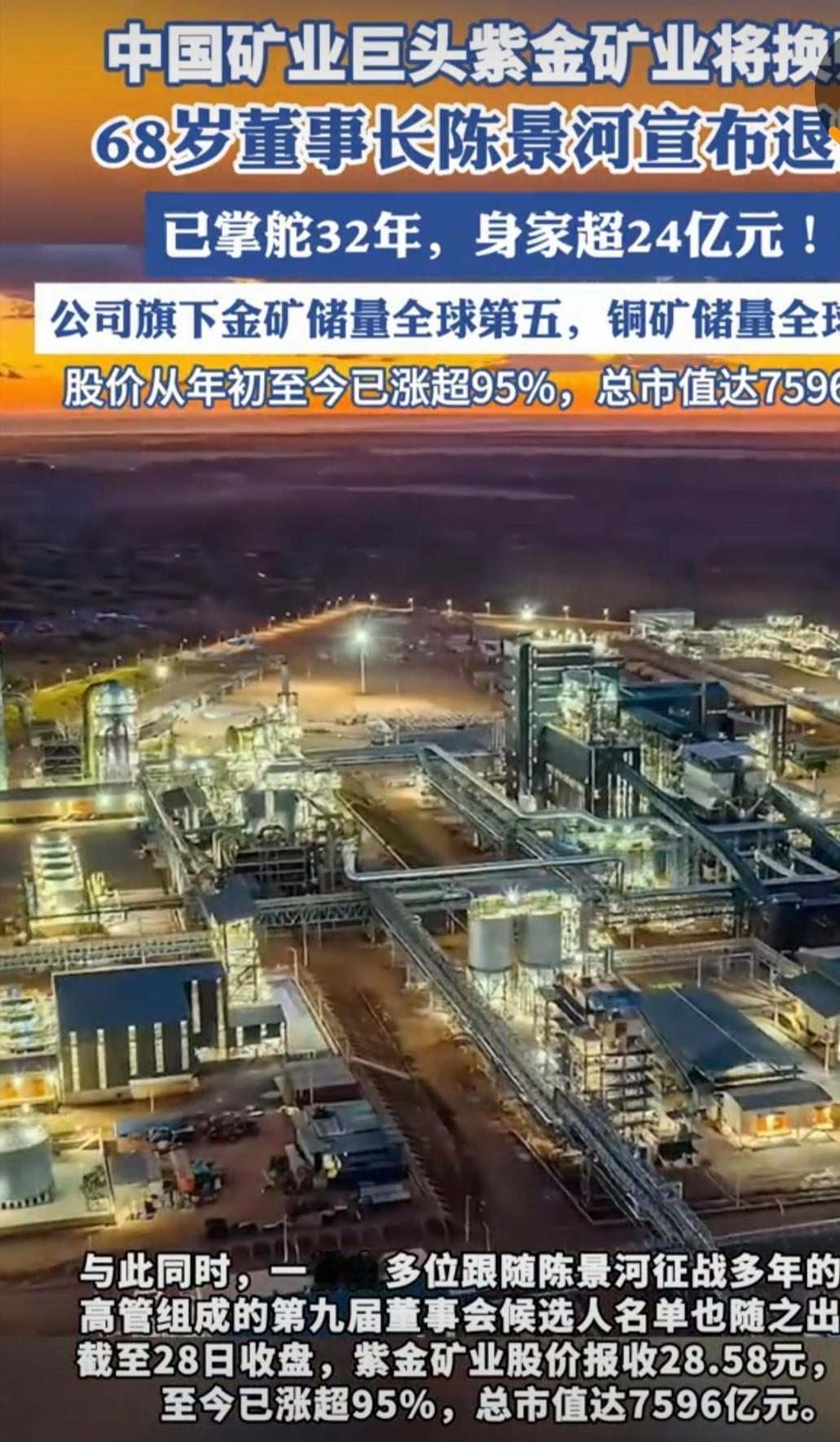 陈景河卸任紫金矿业董事长,一个时代的终结,也是一段传奇的开始。 在中国矿业界,陈景河的名字几乎成为黄金与铜的代名词。他用三十余年的时间,将紫金矿业从一个默默无闻的小矿山,打造成全球矿业巨头,掌控着亿万资产,影响着行业未来。有人说,他是“金矿的魔术师”,更有人敬他为“中国金王”。然而,今天,他正式卸下了这个沉甸甸的“董事长”头衔,这不仅仅是一次职位的变动,更像是一场时代的交接,一份责任的传承。 回望过去的岁月,陈景河带领紫金矿业不断突破技术难关,推动绿色矿业发展,践行可持续战略。他的领导让紫金不仅在国内站稳脚跟,更在国际市场上占据一席之地。这份成就,凝聚了他无数个日夜的努力,也折射出一个企业家对行业的深刻洞察和无私奉献。 但,正如每一个伟大的领袖都知道的,真正的成功不仅在于个人的荣耀,更在于传承与创新。陈景河的卸任,或许意味着他将把更多的时间用在行业的长远布局上,或者投身于公益与教育,继续为中国矿业乃至国家的发展贡献力量。这一决定,彰显了他对行业未来的深远思考,也展现了一个成熟企业家的责任感。 更令人感慨的是,这不仅仅是一个人的退出,更像是一场行业的洗礼。中国矿业正处在转型升级的关键节点,面对全球能源格局的深刻调整,紫金矿业需要新的血液、新的思路。而这背后,是一份对未来的信心和期待。 我们可以想象,未来的紫金矿业,将在新一代领导团队的带领下,继续秉持“绿色、创新、责任”的理念,迈向更高的目标。而陈景河的精神,也将激励无数年轻企业家,勇敢面对挑战,敢于突破极限。 有人说,领导者的退场意味着结束,但更像是新篇章的开启。陈景河用三十多年的坚守,书写了属于他的传奇,也为行业树立了永恒的标杆。而他的离开,不是终点,而是希望的起点——一场关于责任、传承与创新的接力赛,等待着新一代的接棒者。 让我们为这位“金王”喝彩,为紫金矿业的未来祝福。因为,真正的伟大,从不止于一个人的光辉,而在于他们点亮的那一片星空。紫金锂矿 紫金发展