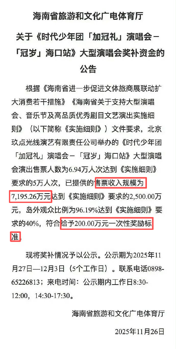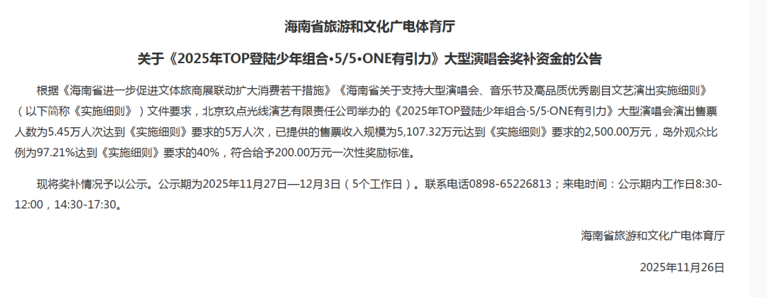 近日,海南省旅游和文化广电体育厅发布公告,宣布对《时代少年团「加冠礼」演唱会-「冠岁」海口站》和《2025年TOP登陆少年组合·5/5-ONE有引力》大型演唱会给予共计400万元的奖补资金。