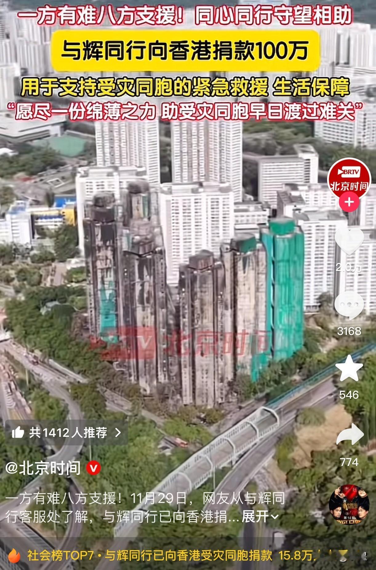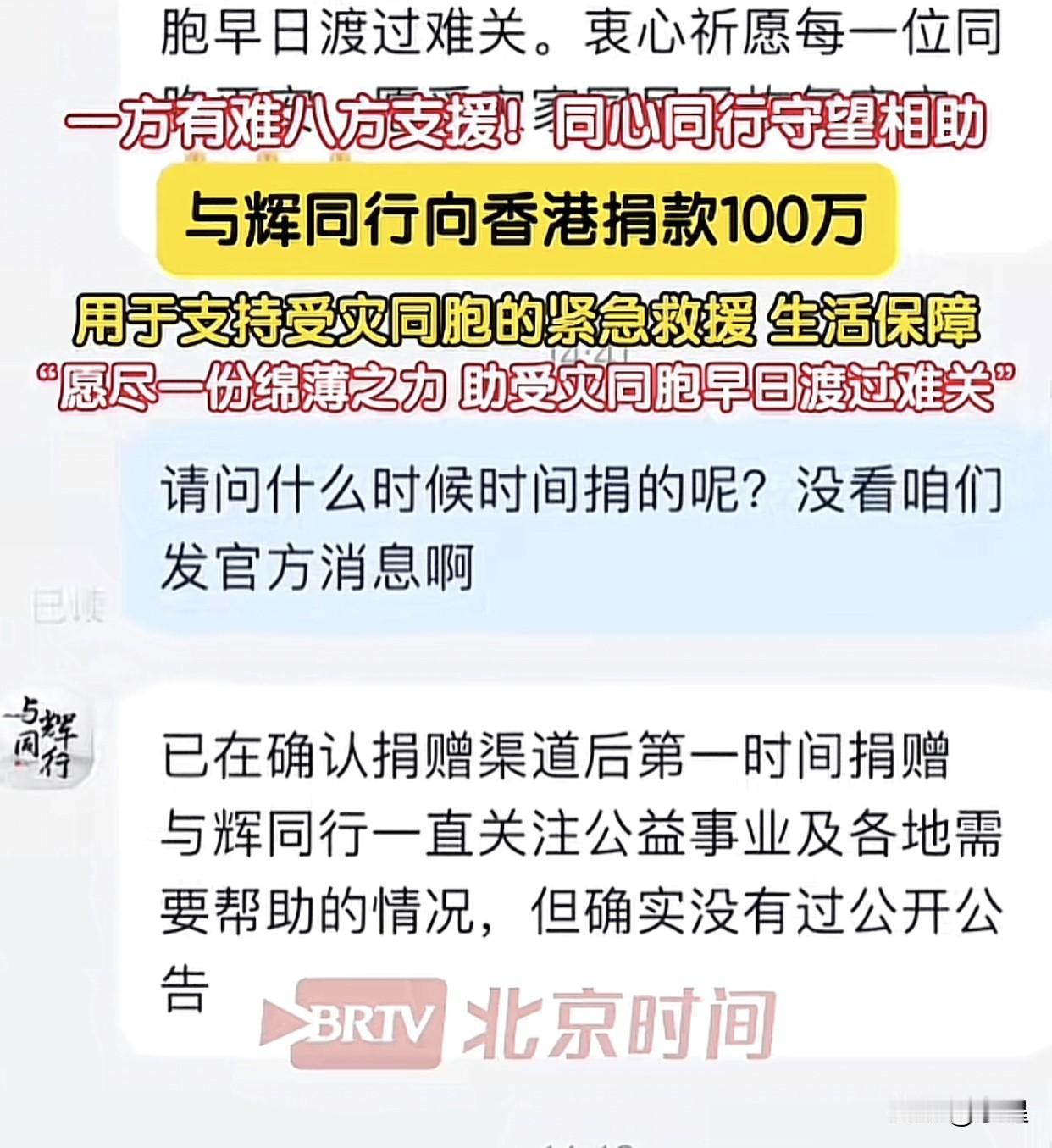 谁这么闲! 总盯着与辉同行有没有捐款 还好北京时间给报道出来了 不然又是一盆脏水 公益捐款本来就是自愿的 什么时候变成道德绑架了?! 了解与辉同行的都知道 他们做公益从来不发公告 近期香港火灾牵动着大家的心 有网友就跑去问与辉同行的客服 问他们捐了没?啥时候捐的?捐了多少?并把聊天记录的截图发了出来 这位网友如此热心的盯着别人 想必捐了不少吧[微笑] 与辉同行只是一个刚刚成立 还非常年轻的团队 他们直播间没有坑位费、广告费 “阅山河”栏目也完全是免费的 每次浩浩荡荡拉着几车设备 带着上百号人去当地做宣传 吃穿住行全都自费 还要请演员、弄晚会、搭场地 成本难道不算吗? 给当地带来的经济效益难道看不见吗? 非要盯着他们捐没捐款? 公益他们会做的 但请某些人保持分寸感 不要一副监督者的嘴脸 慈善公益不应该道德绑架