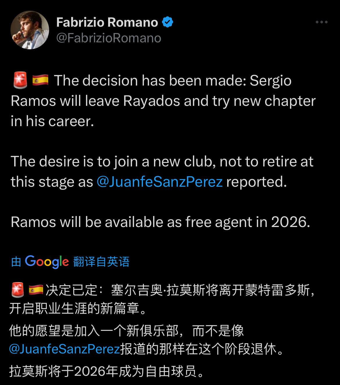 传闻,曾经,马队拉着拉莫斯的手说过,我一定要把你带到我的米兰。 如今,拉莫斯好像到了加盟我米的年龄了! 莫德里奇40岁,在米兰仍是绝对核心,意甲最佳中场! 那39岁的塞尔吉奥.拉莫斯是不是也有可能成为一笔有价值的引援呢? 罗马诺报道,拉莫斯决定离开蒙特雷队,2026年1月份开始将成为自由球员,我米兰想不想掺合一下呢? 拉莫斯和米兰,传奇球员和有声望的球队再联动一把互相成就? 拉莫斯和莫德里奇在米兰再聚首? 塔雷赛季前说的米兰需要有经验的领袖管理更衣室,拉莫斯是合适的人选? 拉莫斯到米兰保持状态,再参加一次世界杯? 不是不可以吧! 拭目以待!