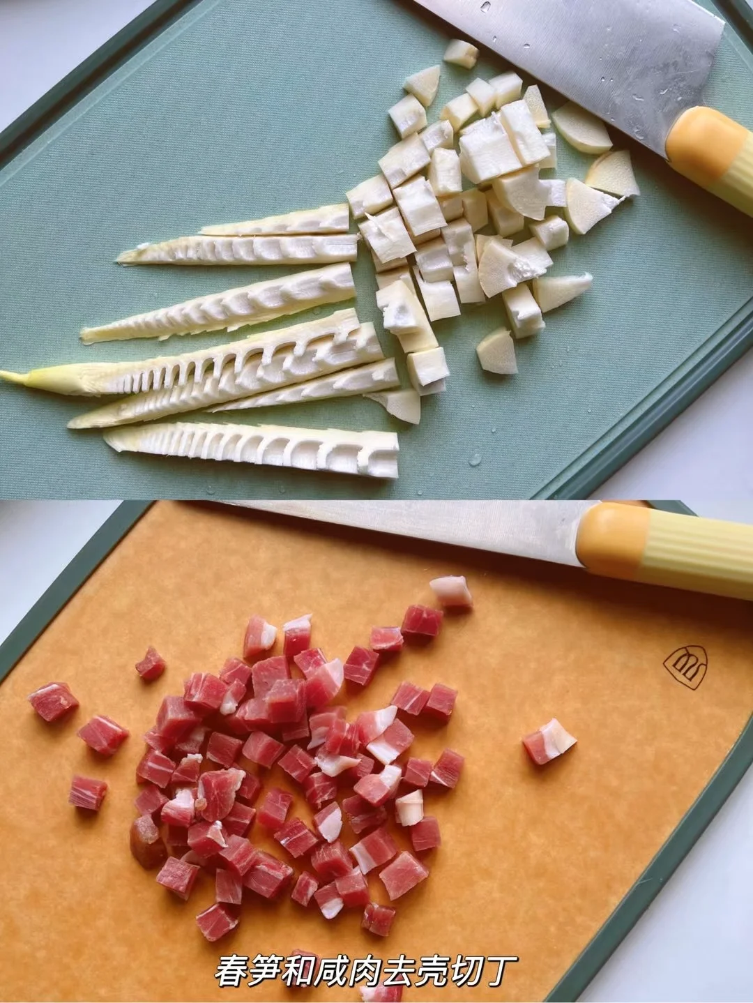 4️⃣米里面加入咸肉、春笋丁,搅拌均匀,按煮饭键(水量比平时少一点,我用的就是最后浸泡的水)
