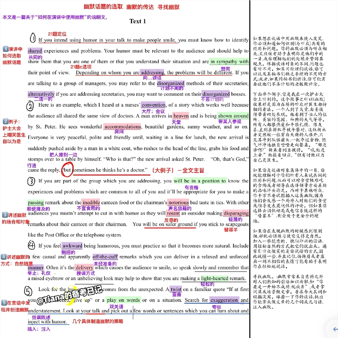 ⚠️参考:黄皮书+唐迟方法论 🌟全文逻辑: 1⃣️演讲中如何选取幽默话题 2⃣️例子:护士大会上嘲笑医生自以为是 3⃣️ 讲述幽默的场合和对象 4⃣️讲述幽默的方式:自然随意 5⃣️在言语中发现并创造幽默 ❗️技巧总结 1⃣️黄金法则:选项中出现一对意思相同选项,同时不选;选项中出现一对意思相反选项,必选其一。(观点态度题除外) 2⃣️串线法:通读各段主题词,找主题词,(各段主题词重复词) 3⃣️主题词:多为各段首句,若第二句有转折(But /yet),主题词后移,为第二句。