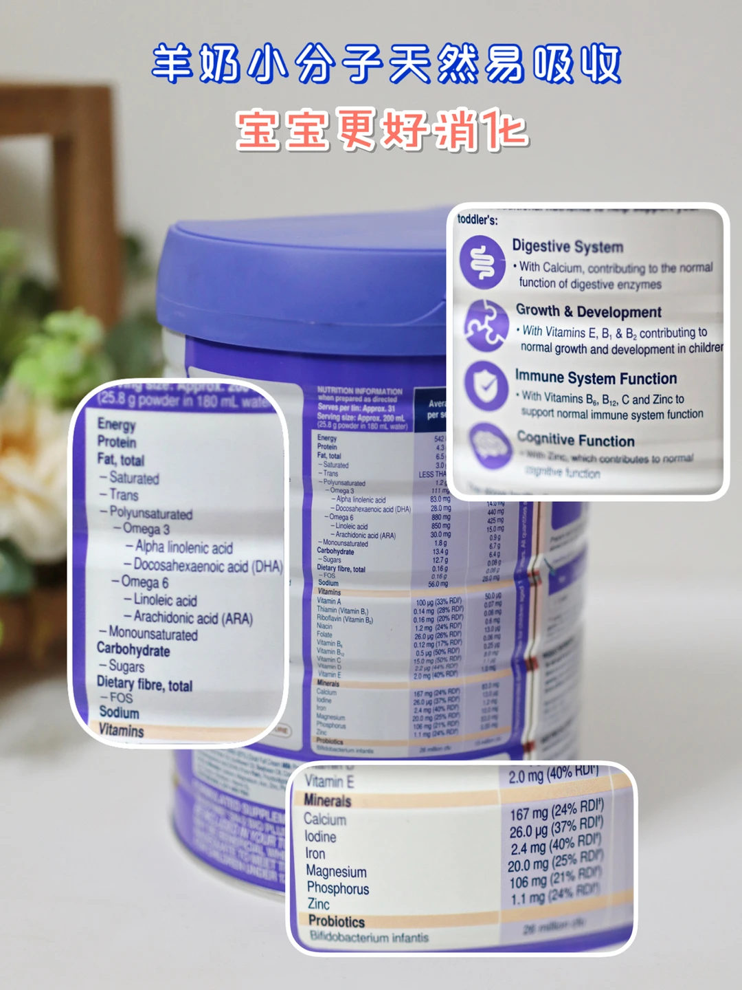而且它是澳洲进口产品,品质还是杠杠滴,含有百分之100%的优质纯羊乳蛋白,和高量的DHA+ARA王炸组合,助力宝宝👀脑发育哦👏👏