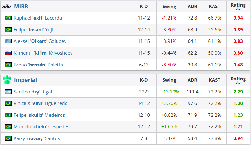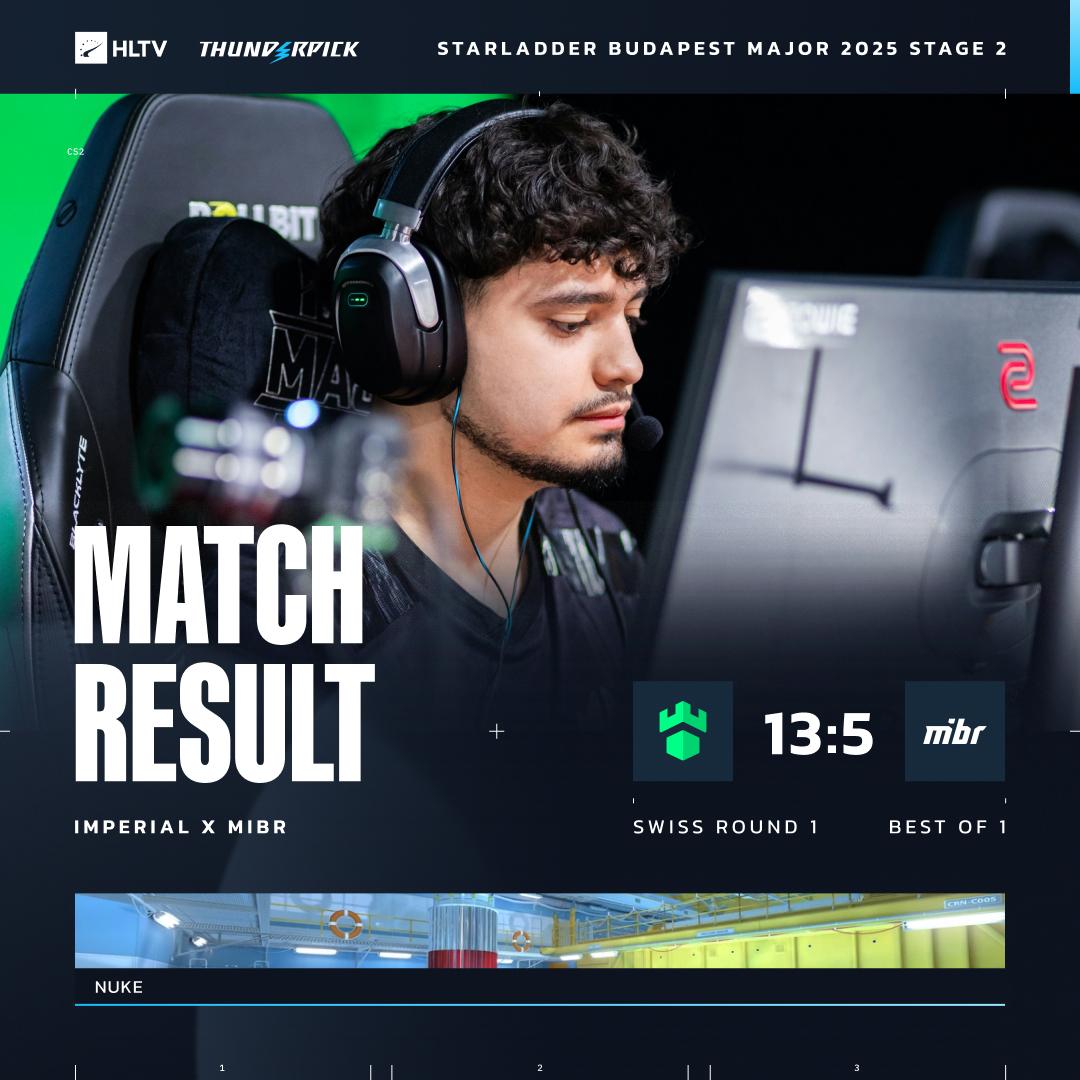 本场巴西内战的地图来到Nuke,Imperial进攻方火力全开,轰出10-2的上半场巨大比分领先,下半场MIBR虽然赢下手枪局试图追分,但随着try在铁门一夫当关的五杀ACE,Imperial直接以13-5轻松拿下MIBR。