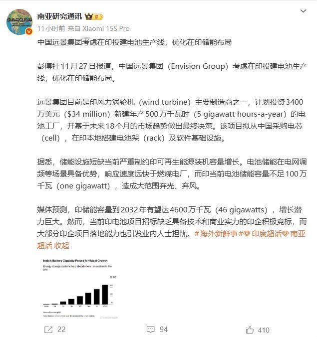 中国远景集团考虑在印投建电池生产线,优化在印储能布局 资本家没有国界