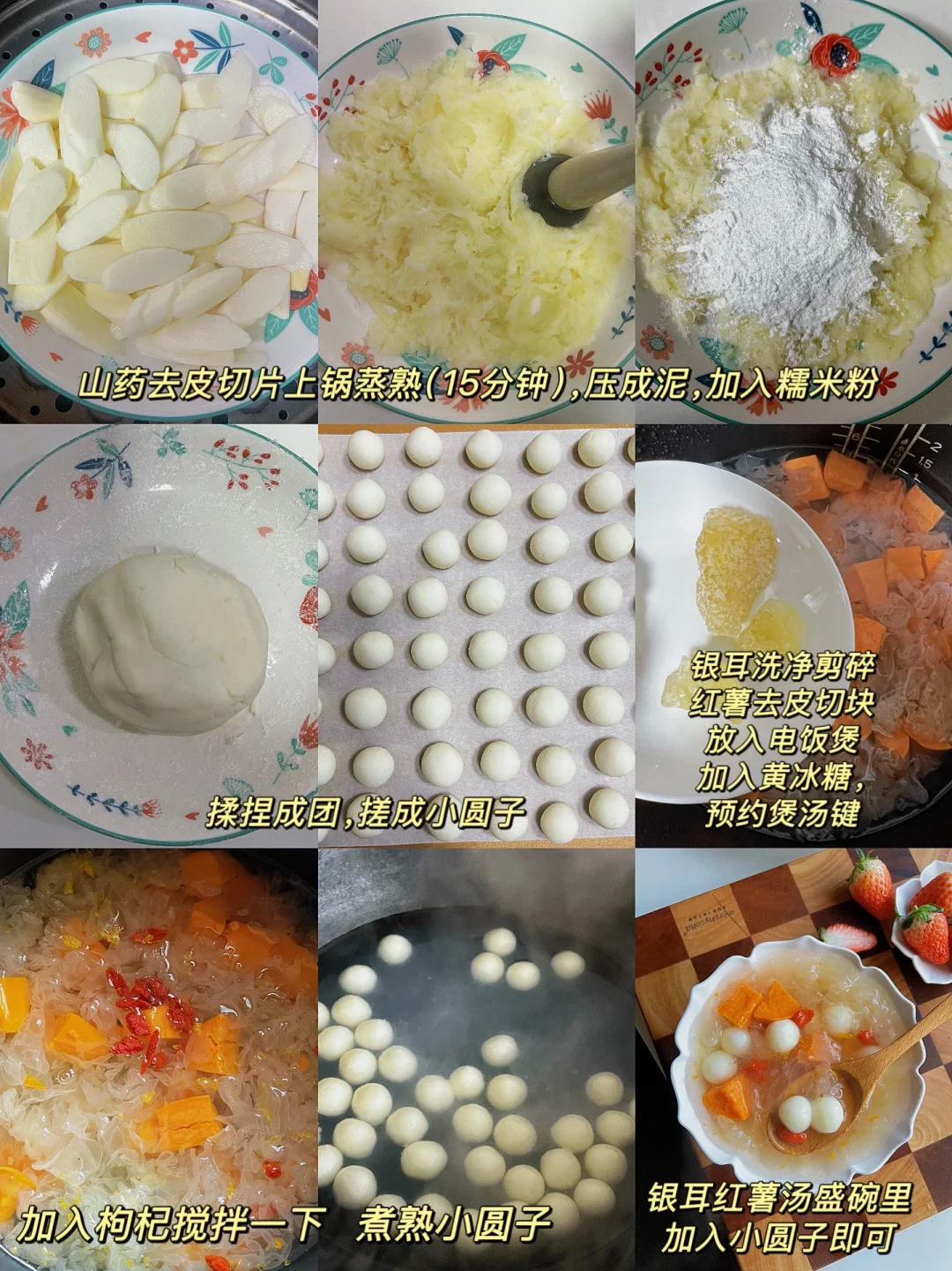 2️⃣银耳洗净剪碎,红薯去皮切块,加入黄冰糖,放电饭锅预约煲汤健