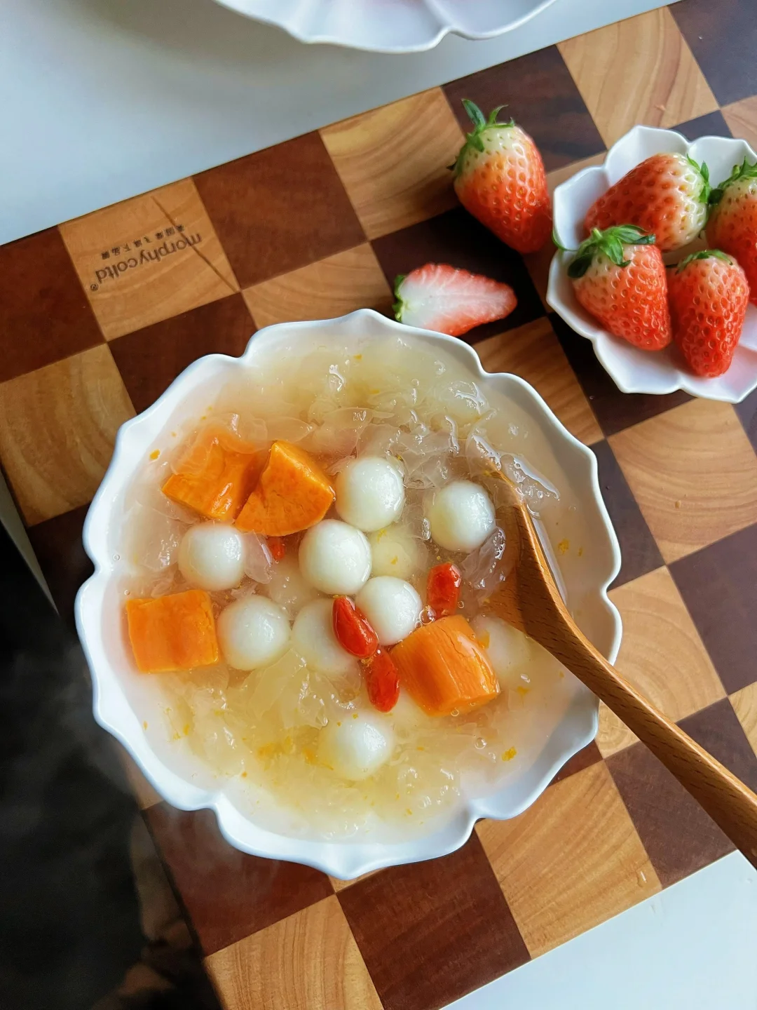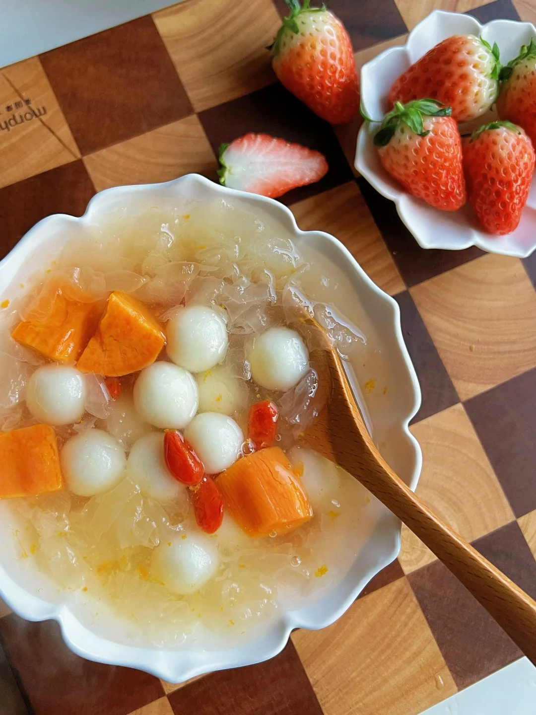 2️⃣银耳红薯汤加入枸杞,搅拌一下,盛碗里,加入小圆子即可