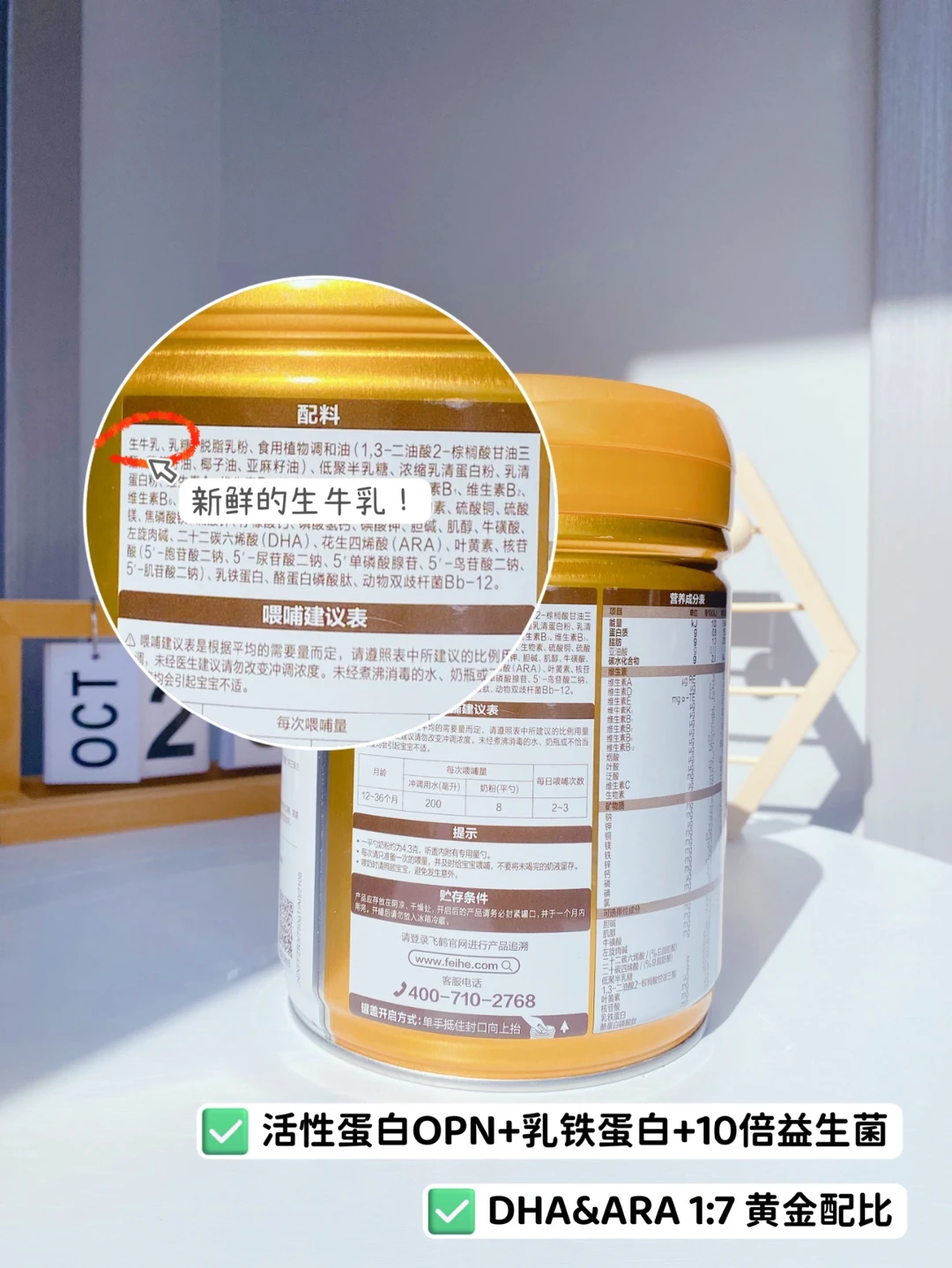 ✔️飞鹤牧场位于北纬47度黄金奶源带,从挤奶到加工只需要2小时,以新鲜生牛乳为奶基原料,营养保留得更好,口味也是淡淡的奶香味,宝宝很爱喝,一口气就能咕噜噜喝光光~这款奶粉营养成分比较全面,富含宝宝成长所需的9大关键营养素!尤其是活性蛋白OPN和乳铁蛋白、10倍益生菌,由内而外提升宝宝自护力,宝宝状态更好,每天活力十足