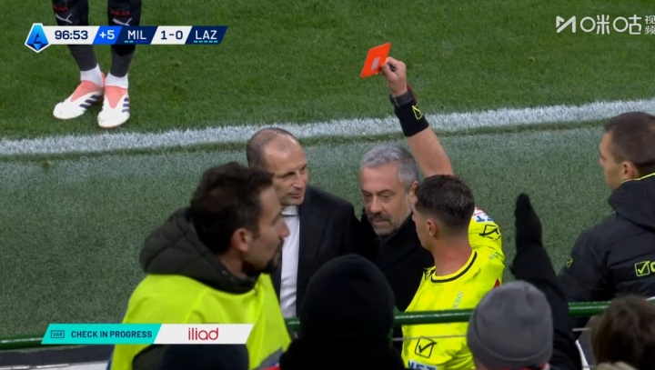 米兰vs拉齐奥补时第95分钟,裁判介入看VAR,检查帕夫洛维奇手球!阿莱格里怒了!被出示红牌!