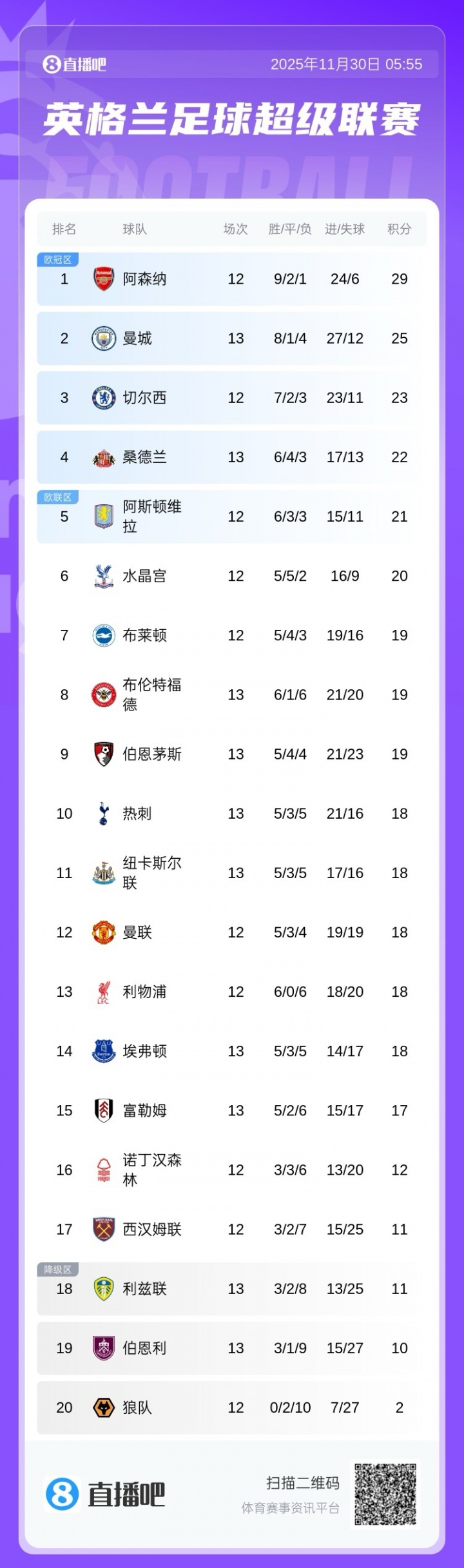 英超积分榜:曼城暂升第2,热刺4场不胜第10,明天切尔西vs阿森纳