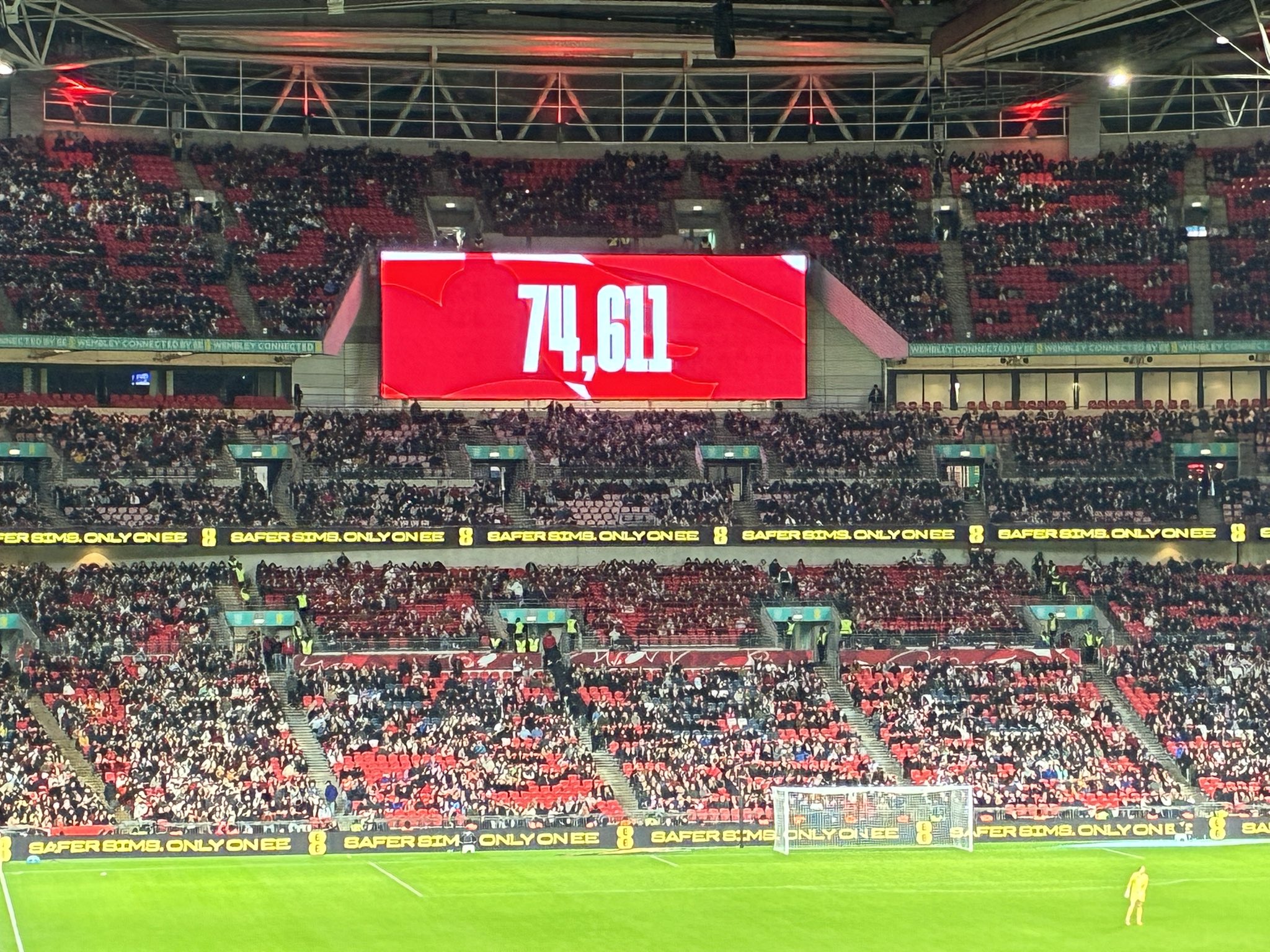 据现场播报,本场比赛共有74611名观众来到温布利大球场现场观赛。