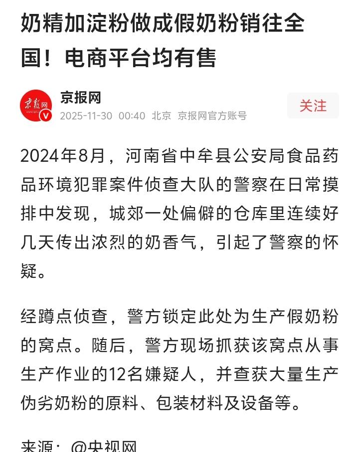 奶精淀粉勾兑假奶粉流向万千家庭!电商平台成帮凶,谁在吞噬中国孩子的未来? (來源:@央視網) 当奶粉罐里装的不再是牧场精华,而是奶精与淀粉的致命混合物;当婴儿的啼哭换不来营养补给,反而迎来发育迟缓的威胁——我们不得不质问:这片土地上,究竟还有多少黑心商人正将魔爪伸向最脆弱的群体? 河南中牟县郊外,一处隐蔽仓库终日飘散着不正常的奶香。这气味没有草原的清新,只有化学香精的甜腻。警方顺藤摸瓜,揭开了这条触目惊心的产业链:三无作坊用每公斤成本不足十元的原料,炮制出“进口奶粉”的假象,通过电商平台销往全国。被查获时,仓库里堆满印着外文的包装罐,而流水线上只有奶精、淀粉和香精的混合物。 更令人心惊的是,这些假奶粉的流向精准锚定了信息洼地。农村乡镇的父母们,怀着“给孩子更好营养”的朴素愿望,在电商平台搜索“平价奶粉”“进口奶源”时,算法推送的竟是这些披着华丽外衣的毒饵。有受害者家属哭诉:“孩子喝了三个月,体重不增反减,医院诊断出营养不良!” 暴利是驱动罪恶的永动机。一罐成本不足二十元的假奶粉,贴上伪造标签后售价飙升至三百元。黑心商家在审讯中直言:“婴幼儿钱最好赚,父母再穷也会给孩子买奶粉。”当人性在利益面前彻底沦陷,道德底线便成了笑话。 电商平台的监管失守更让公众愤慨。涉事店铺证照不全、销量异常,却能在平台活跃数月。算法推荐机制成了假货的“帮凶”,而平台审核形同虚设。有内部员工透露:“商家交够佣金就能上首页,谁管产品是奶粉还是面粉?” 这背后是食品安全防线的全面溃败。从三聚氰胺到假奶粉,每次教训都鲜血淋漓,却始终未能根除病灶。违法成本过低是关键症结——造假者即便被查,往往只需缴纳罚款,而受害者维权却要经历漫长诉讼。有法律学者疾呼:“应将食品安全犯罪视同投毒,适用重典!” 父母的恐慌与无助正在蔓延。社交媒体上,无数家庭晒出奶粉检测视频,有人驱车百公里只为购买一罐可靠奶粉。当最基本的育儿物资都需要“斗智斗勇”,生育焦虑如何不加剧?信任危机如何不深化? 治理之道在于织密天罗地网。需建立奶粉溯源强制系统,让每罐奶粉都有“电子身份证”;压实平台主体责任,实行“先行赔付”制度;更要打破地域壁垒,建立全国联动的吹哨人机制。正如网友所言:“如果每次违法都意味着倾家荡产,谁还敢拿孩子的健康赌博?” 此刻,我们每个人都是这场战役的参与者。当你看到可疑商品时的一次举报,选择产品时的一次查验,都是对黑产链条的重击。孩子的未来不该成为商业利益的祭品,他们的微笑必须由真诚与责任守护。 假奶粉黑幕 食品安全警钟长鸣