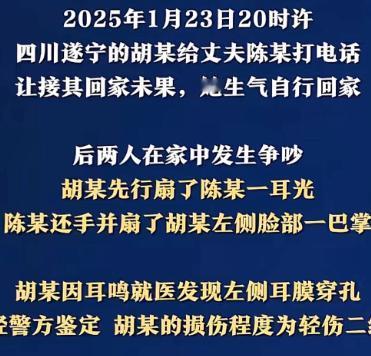 “冤不冤?”四川遂宁,女子打电话让丈夫接她下班,可丈夫却没接,女子心里憋了股火,回家后和丈夫大吵一架,争执中,女子扬手给了丈夫一巴掌,没想到,丈夫反手还了她一巴掌,还把她打成耳膜穿孔,经鉴定为轻伤二级,这下性质彻底变了,检察院认为应该以故意伤害罪追究丈夫的刑事责任,可丈夫一方认为这是正当防卫,顶多算防卫过当。法院判决出乎意料! 四川遂宁的陈家小区里,黄昏的暮色缓缓笼罩大街小巷。胡女士刚下班,拖着有些疲惫的身体,拎着公文包走出公司大门。 她手机里显示着丈夫陈某的名字,手指悬在屏幕上——她已经连续打了几次电话,希望丈夫能来接她下班。然而电话始终无人接听,语音信箱冰冷地提示着未接来电。 心里涌上一股说不清的火气——平日里丈夫总是很顾家,可今天竟然连一个接电话的动作都没有。 胡女士沿街走回家,脑海里不断翻腾着各种念头:是不是丈夫又在忙别的事情?是不是又忘了约定? 走路的节奏因为心情而略显急促,手指紧紧握着手机,偶尔低声嘀咕几句抱怨。街边小吃的香气飘来,她没有心思去理会,只想早点回家,好好和丈夫算一算这笔“账”。 回到小区门口,胡女士看到丈夫正坐在沙发上玩手机,眉头微蹙,神情专注。 她忍不住抬高了声音:“你今天怎么回事?电话不接,连一句解释都没有!”声音里带着被忽视的委屈和愤怒。 丈夫陈某放下手机,抬头看向妻子,眉头一挑:“我忙着开会,你一直打电话,打扰到我工作了。”语气里有些无奈,但也带着一丝防御的意味。 胡女士觉得丈夫的话更像是一种推卸责任的借口,心里的火气更盛了:“忙?你忙到连接我电话都做不到? 我下班那么累,就想你来接我,这很过分吗?”她的声音逐渐提高,手指在空中比划着,身体微微前倾,显然情绪已经失控。 争吵越来越激烈,口角升级为肢体冲突。胡女士一气之下,扬手给了丈夫一巴掌,声音清脆而有力。 陈某本能地后退一步,但愤怒迅速涌上心头,他反手给了妻子一巴掌,这一下的力度超过了胡女士的预期,直接打在她耳侧,瞬间疼痛袭遍全身。 胡女士只觉得耳内轰鸣,随即耳膜剧烈疼痛,听力瞬间受损。 眼泪和愤怒交织在一起,胡女士倒在沙发边,身体颤抖。 陈某看到妻子痛苦的表情,心里也感到一阵复杂:愤怒、悔恨和无奈混杂在一起。事后送医检查显示,胡女士的耳膜穿孔,经过鉴定为轻伤二级。 事件发生后,小区邻居闻声而来,有的劝架,有的打电话报警。民警到达后,胡女士和陈某分别陈述了当时的经过。 胡女士强调,自己只是生气打了他一巴掌,丈夫反受伤害明显超过了正常争执的范畴;而陈某则称,自己只是出于自卫,认为妻子先动手,他的反应属于防卫行为。 案件进入司法程序后,检察院认为,陈某的行为已经超出了合理防卫的范畴,其伤害行为构成故意伤害罪,应追究刑事责任。 可陈某及其家属则坚称,打人行为是“正当防卫”,顶多算防卫过当,否认故意伤害的刑事责任。 法院经过审理,对案件的证据进行了全面评估:包括现场邻居证言、医疗鉴定报告、双方口供及当时的监控录像。 法官认为,虽然胡女士先动手,但陈某的反击力度过大,直接造成了对方轻伤二级的结果,其行为已经超出了必要的防卫限度,因此不能认定为单纯正当防卫。 最终,法院作出判决:陈某以故意伤害罪被判拘役6个月,并依法承担相应的法律责任。 判决宣告后,陈某神情复杂,低头默默接受判决;胡女士则在情绪缓和后,开始思考夫妻之间沟通和冲突管理的重要性。