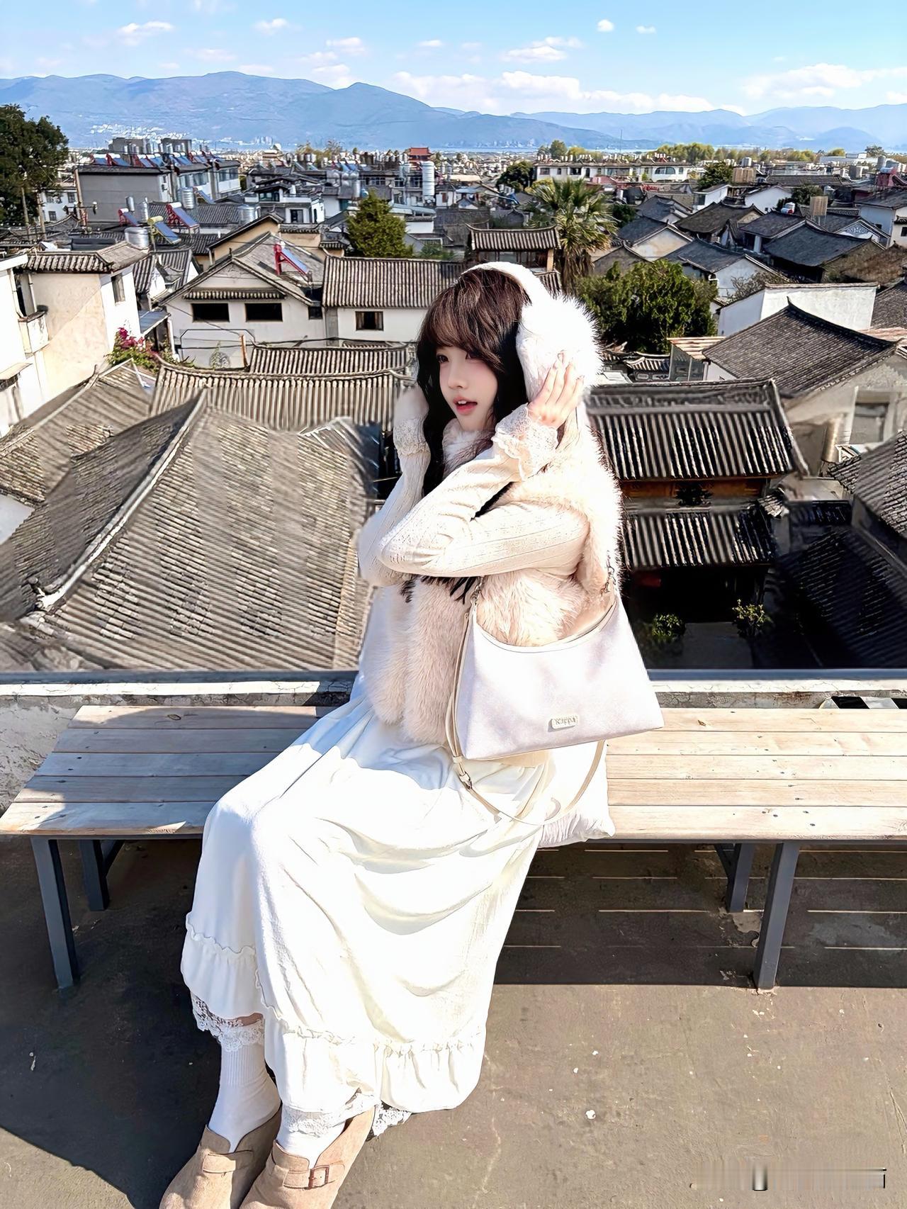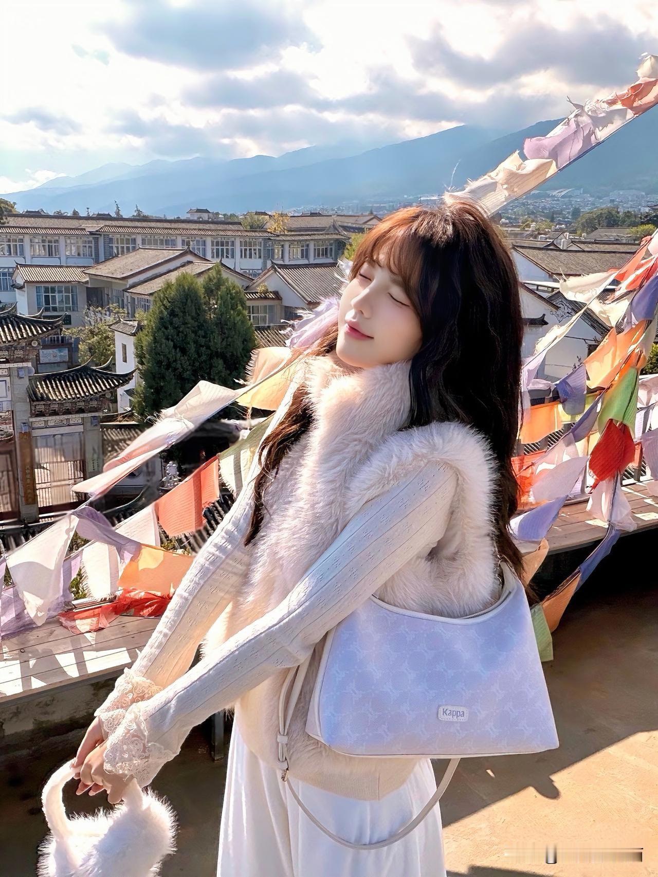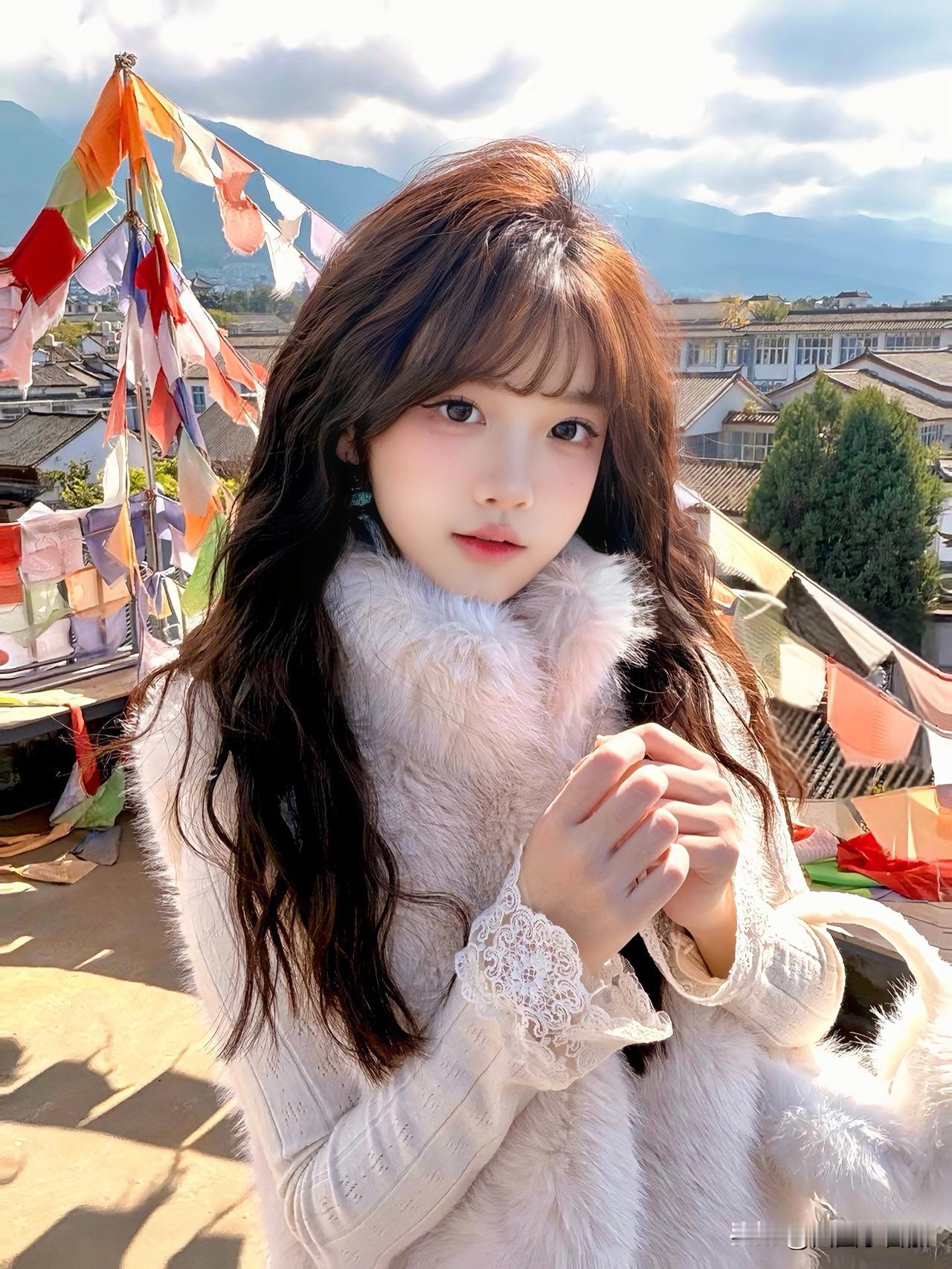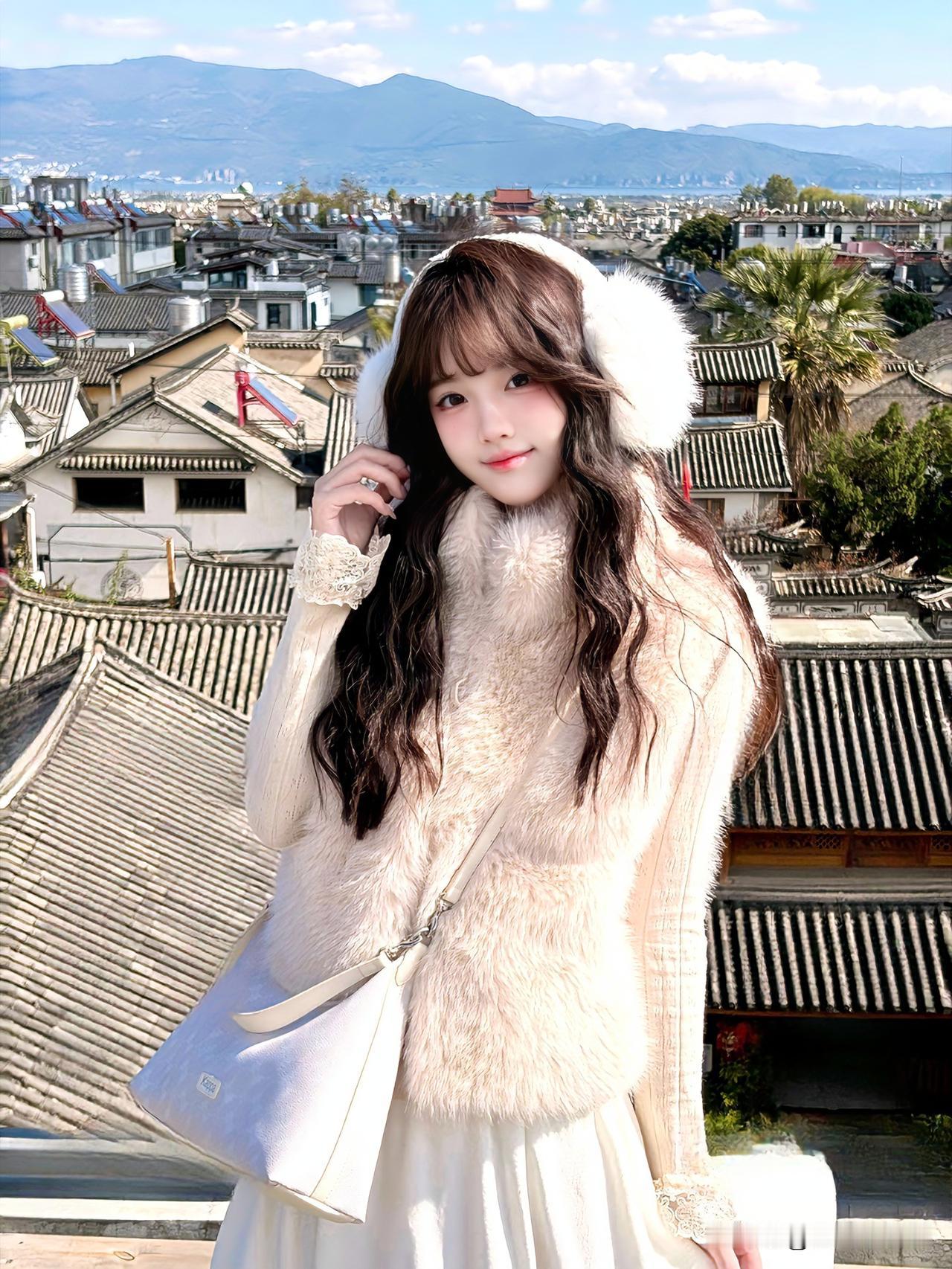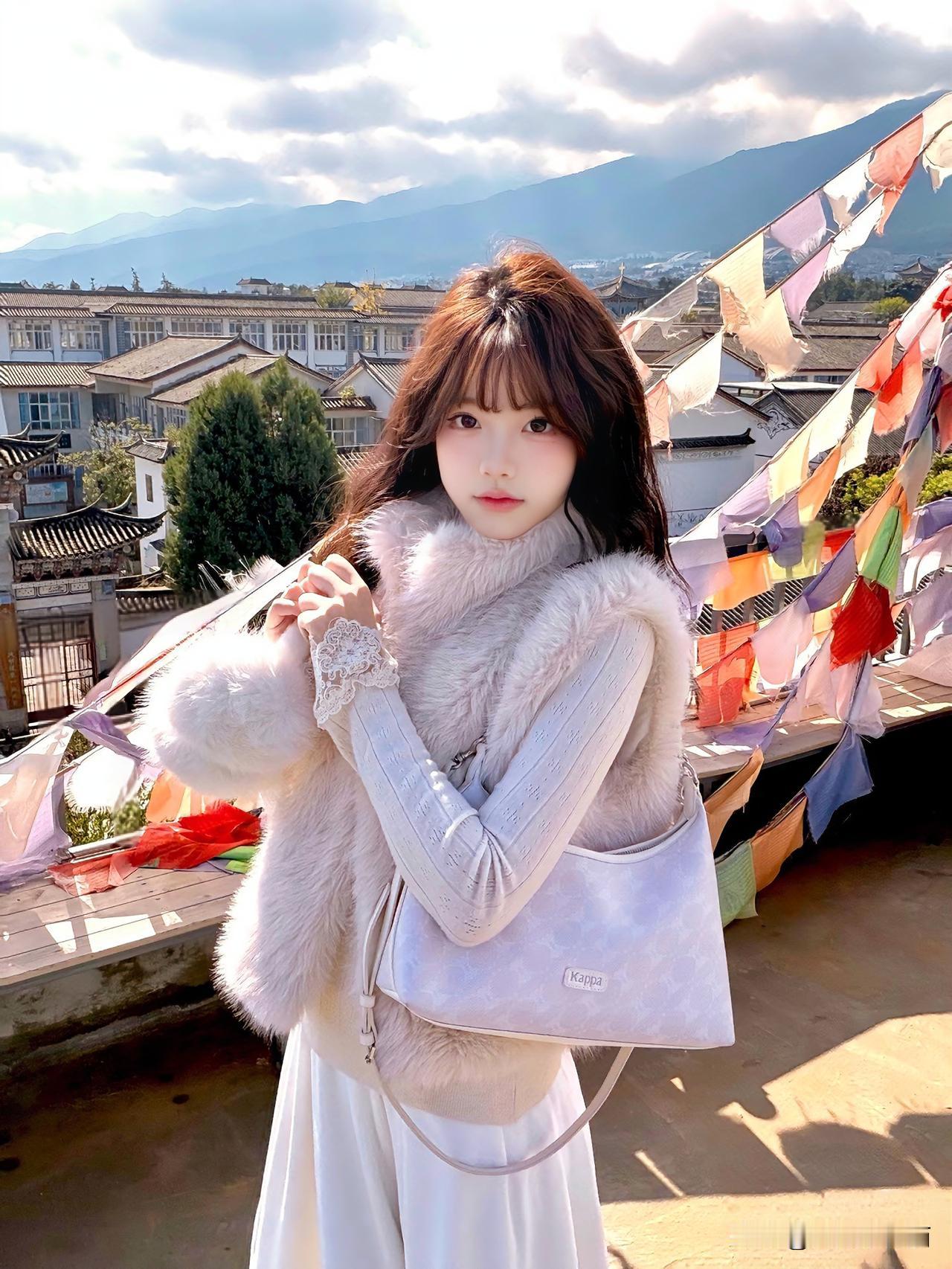 『大理深秋ℓ风花雪月里的温柔邂逅』 大理的秋天,总藏着风花雪月的诗意。 青瓦白墙的村落漫过苍山脚下,五彩经幡在风中轻舞,轻着素色毛衣与绒绒围巾的她,静坐檐下。阳光洒落,将温柔揉进每一道古城的褶皱里,连远山都染上了恬静的色泽。 这秋意不似北国凛冽,而是带着洱海的湿润与古城的烟火,将时光酿得醇厚。 美少女美景分享