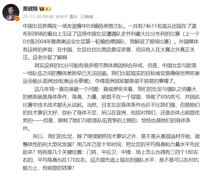 直播吧11月30日讯中国女足友谊赛0-8惨败英格兰女足,黄健翔发文谈到了中国女足。