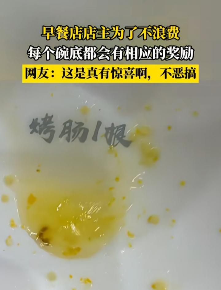 烤肠1根、鸡蛋1个、苏打水1瓶…… 早餐店为了不让食客浪费,在每个粥碗底设了不同的奖励,吃完就能得奖励,跟开盲盒一样,就想赶紧吃完看看奖励是什么。这专治不爱吃饭的孩子啊!对孩子来说,没什么比这种小奖励更能吸引他们的了,不用劝,不用催,吃完,领奖励,满满的成就感 别说孩子了,我也很期待,吃完就能免费得一个小赠品,谁不喜欢?老板这主意太妙了,既杜绝了浪费现象,又吸引了顾客,为了这奖励,每天都会有很多人来打卡,这方法值得推广啊
