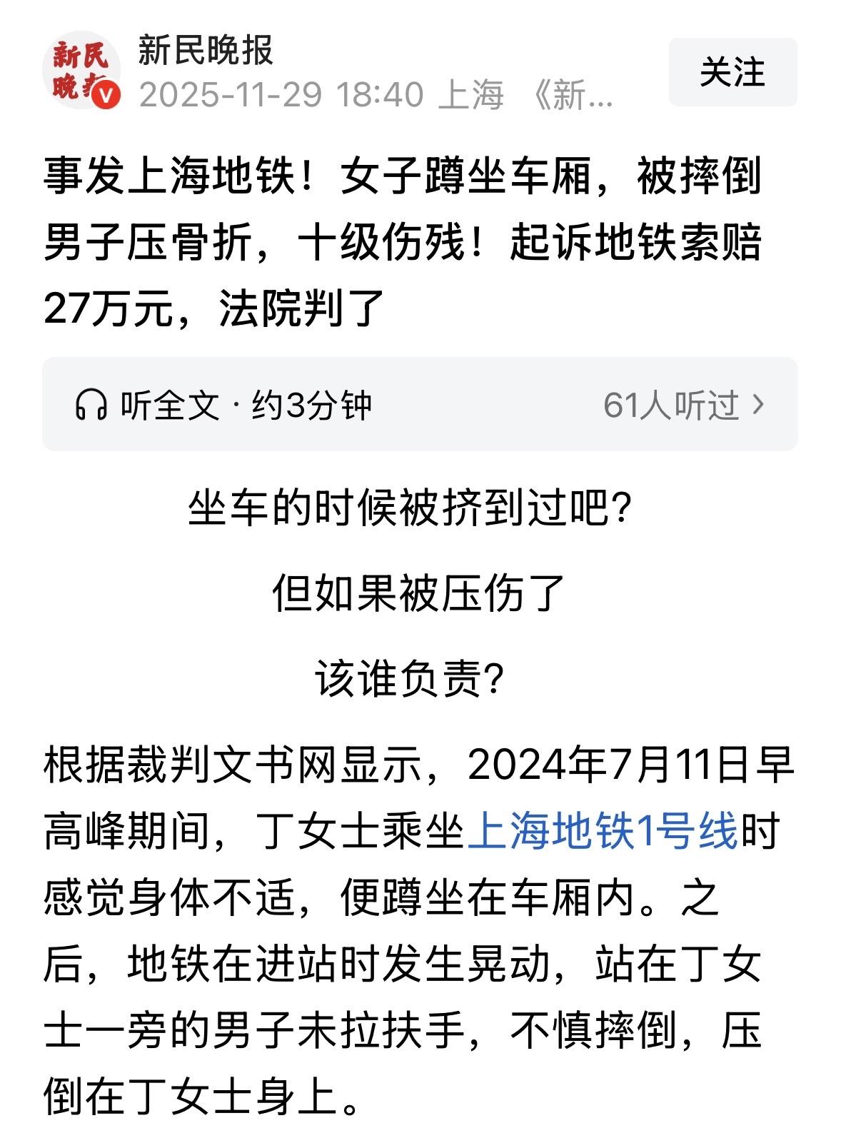 上海,女子早高峰坐地铁时身体不舒服,就蹲坐在车厢里,没想到,地铁进站时发生晃动,站在女子一旁的男子恰好没拉扶手,一个没站稳直接摔倒压在女子身上,把女子压成腰椎骨折,构成十级伤残,让人意外的是,女子事后并没向男子追责,而是把地铁公司告上法院索赔27万,法院这样判了。 2024年7月11号早上,地铁1号线迎来早高峰最拥挤的时段。 丁女士像往常一样挤进车厢,可刚站稳没2分钟,她就感觉胃里一阵翻江倒海。 可能是早餐吃得不干净,加上例假腹痛,她额头冒出冷汗,眼前发黑。 实在撑不住的她,扶着座椅边缘慢慢蹲坐在两排座位之间的空隙处,背靠着金属隔板喘气。 8点零3分,列车缓缓驶入人民广场站。就在减速进站的瞬间,轨道衔接处传来轻微的“咯噔”声,车厢突然晃动了两下。 站在丁女士斜后方的男子小陈(化名)正低头看手机,双手插在牛仔裤兜里没抓扶手,这一下晃得他重心不稳,整个人朝侧面倾倒。 小陈这一倒,恰好压在蹲坐的丁女士背上,小陈见状连忙道歉,说自己没扶手可以拉了,这才没站稳,不是故意的。 丁女士此时什么解释都听不进去了,她只觉下半身瞬间麻木无法动弹,疼得眼泪都要出来。 地铁到站后,收到消息的站务员迅速赶到,用担架将丁女士抬下列车送往医院。 急诊CT显示她的腰椎第二、三节骨折,术后鉴定为十级伤残,医生告诉她至少需要卧床三个月,后续康复治疗也需要很长时间。 这场意外彻底打乱了丁女士的生活,她不得不请假在家修养。 2025年2月18号,丁女士直接将上海铁路运输法院告上法院,要求对方赔偿她医疗费、误工费、护理费、伤残赔偿金总共27万元。 她认为,地铁公司作为公共交通运营方,有义务保证列车平稳运行。事发时车厢广播确实在提醒站稳扶好,但早高峰人挤人,扶手根本不够用,地铁公司没控制客流导致乘客无扶手可抓,这才是事故主因。 地铁公司则认为,安全提示广播全天候循环播放,每个乘客进站时都能听到。 丁女士作为成年人,明知早高峰车厢拥挤还故意蹲坐,相当于把自身置于危险境地。监控显示其他未扶扶手的乘客只是轻微摇晃,只有她身边男子摔倒,说明问题出在她蹲坐的行为上,这是重大过失! 庭审当天,法官调取了车厢监控录像。画面里,列车进站时的晃动幅度确实不大,多数乘客只是身体微倾。 唯独小陈站立的区域,因为丁女士蹲坐后占据了部分空间,导致他站立时失去平衡支点。 那么,从法律角度看,这件事的责任该怎么划分? 《民法典》第1198条规定:宾馆、商场、银行、车站、机场、体育场馆、娱乐场所等经营场所、公共场所的经营者、管理者或者群众性活动的组织者,未尽到安全保障义务,造成他人损害的,应当承担侵权责任。 地铁公司属于“公共场所经营者”,需对乘客履行合理限度的安全保障义务。 这个义务就包括硬件设施维护,如扶手、防滑装置,运营安全管控,如平稳驾驶、客流疏导,以及安全提示告知,如“站稳扶好”广播, 地铁公司虽然循环播放安全提示,但没有针对早高峰超设计客流采取限流、增设临时扶手或安排引导员等实质措施,导致乘客无扶手可抓,属于“未完全履行安全保障义务”。 根据《民法典》第1173条“被侵权人对同一损害的发生有过错的,可以减轻侵权人的责任”,法院认定丁女士的蹲坐行为构成“一般过失”。 法官认为,丁女士蹲坐行为虽属自助行为,但在人群密集的公共场所,该姿势客观上增加了被他人碰撞的风险。结合其当时身体不适的具体情况,这种过失属于一般过失,尚未达到严重不负责任的程度。 对于地铁公司的责任认定,法官指出:作为专业运输机构,除了播放安全提示,还应根据客流情况采取限流、增派引导员等措施。事发时段车厢乘客密度已超设计标准,地铁公司未采取有效疏导措施,对乘客安全负有主要保障义务。 最终,法院判决地铁公司承担70%赔偿责任,需向丁女士支付15万元。 有人看后很同情丁女士的遭遇,说谁还没个身体不舒服的时候?地铁公司不能光靠广播提醒就推卸责任。 也有人认为不舒服就下车,蹲在车上本身这姿势就危险,还容易绊倒别人。 这就是为什么不能带椅子上地铁自己在空地上坐的原因。地铁方面以后贴标语提示,不能蹲着,不能自带椅子坐,还要配巡视员才行。 不过奇怪的是,事故中的“第三人”小陈始终未现身法庭,从始至终都置身事外。 有人觉得这名男子也有责任,女子为何不告他呢? 不过,这名男子当时肯定也是没料到到脚下有人蹲着,如果知道肯定会扶稳。不过幸运的是,他并没有被追责,但相信通过这件事,男子以后肯定是吃一堑长一智了。 对此,你怎么看? 关注@运良说法. 学法律知识不迷路