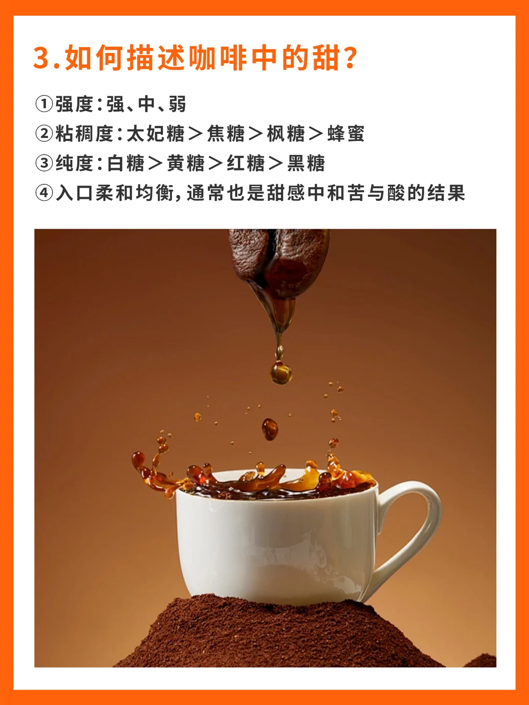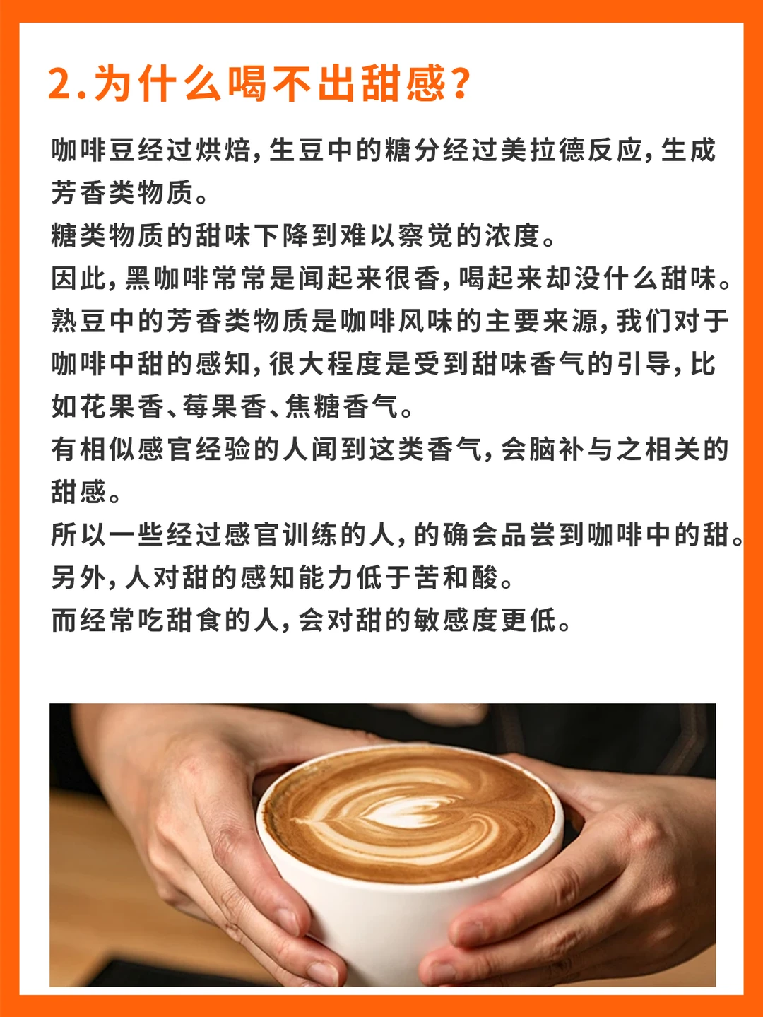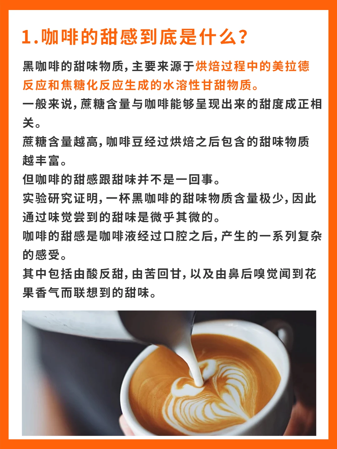 但咖啡的甜感跟甜味并不是一回事。实验研究证明,一杯黑咖啡的甜味物质含量极少,因此通过味觉尝到的甜味是微乎其微的。咖啡的甜感是咖啡液经过口腔之后,产生的一系列复杂的感受。其中包括由酸反甜,由苦回甘,以及由鼻后嗅觉闻到花果香气而联想到的甜味。