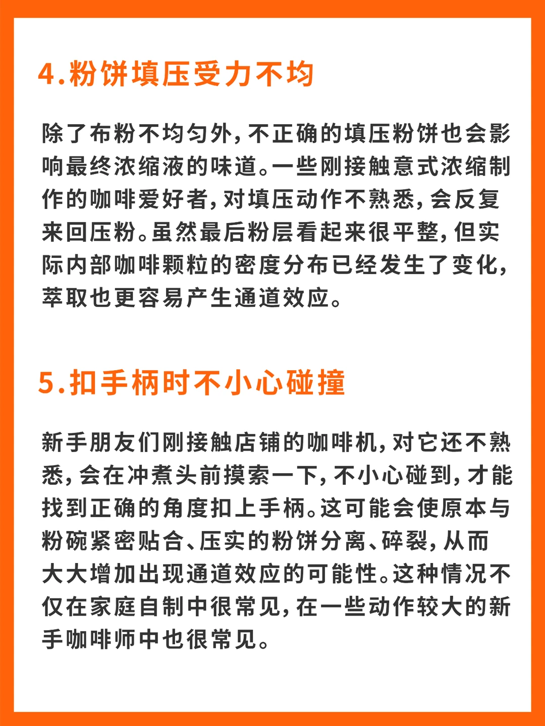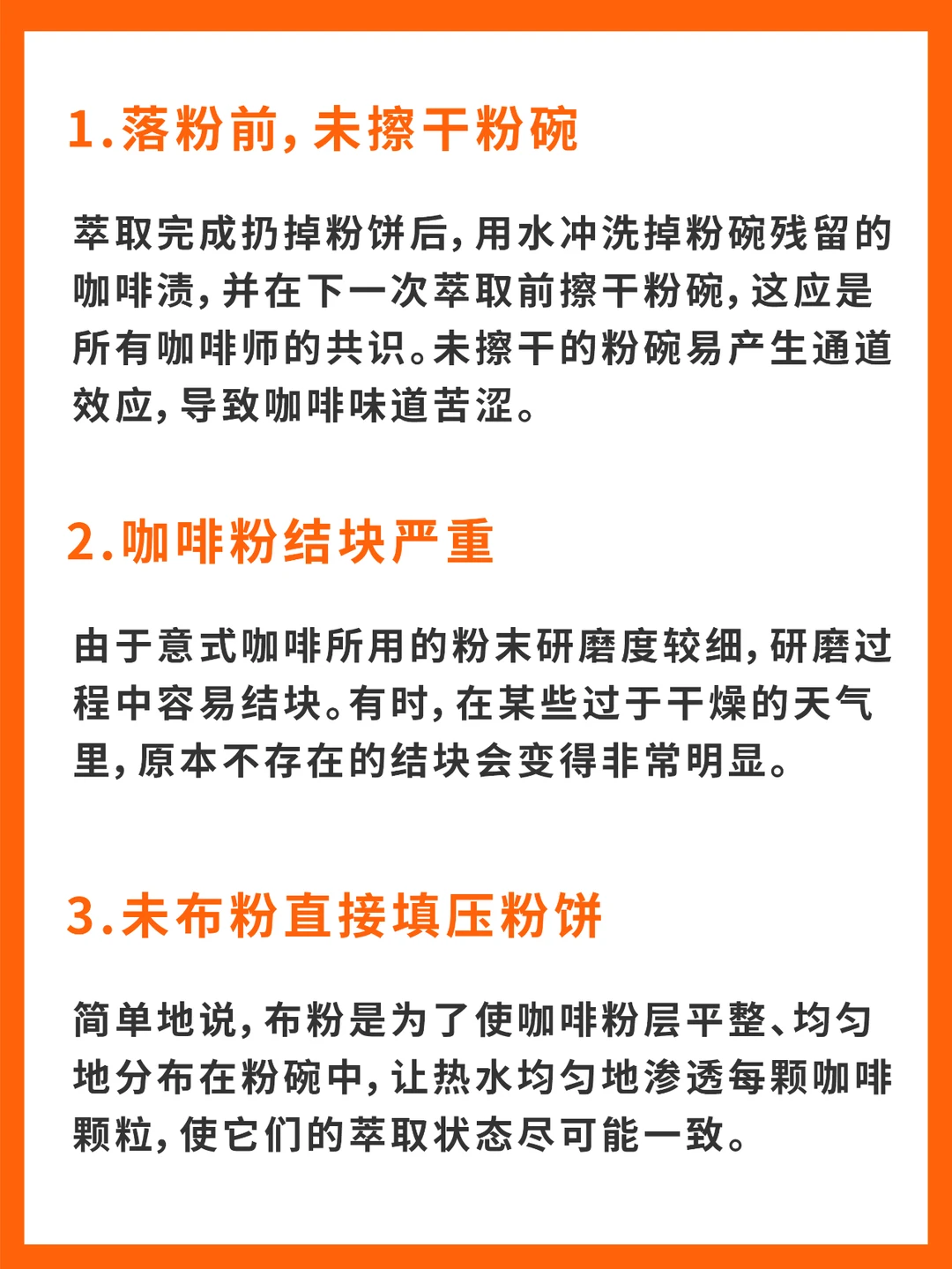 新手朋友刚接触店铺的咖啡机,对它还不熟悉,会在冲煮头前摸索一下,不小心碰到,才能找到正确的角度扣上手柄。这可能会使原本与粉碗紧密贴合、压实的粉饼分离、“碎裂”,从而大大增加出现通道效应的可能性。这种情况不仅在家庭自制中很常见,在一些动作较大的新手咖啡师中也很常见。