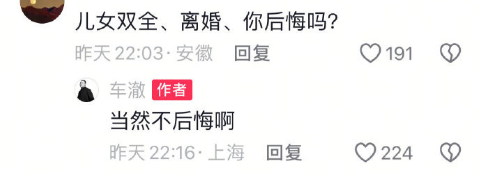 车澈不后悔离婚车澈谈与李嘉格离婚 车澈回应与李嘉格离婚,表示不后悔,如果时间倒回还会离婚。网友:“儿女双全、离婚、你后悔吗?”车澈:“不后悔啊”。网友:“如果时间倒回你还会离婚吗?”车澈:“会”。