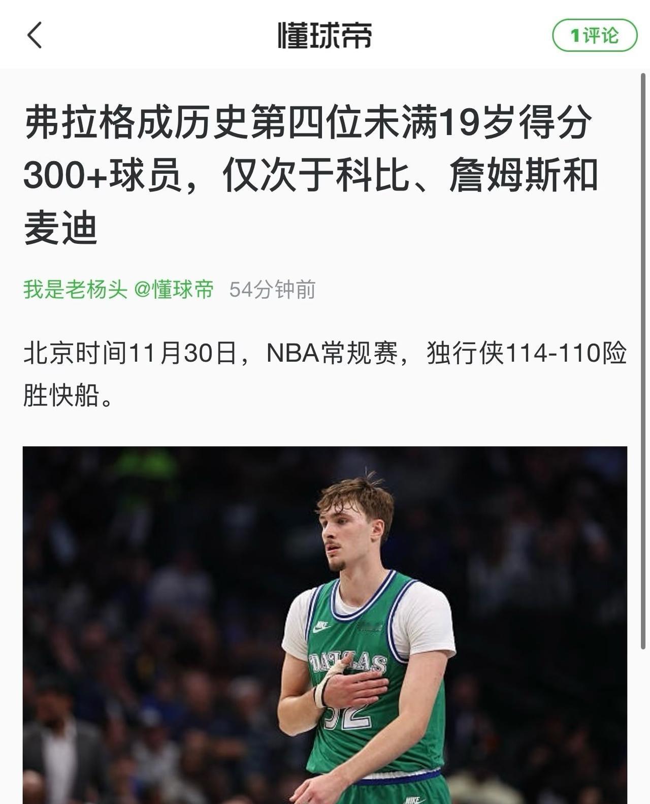 18岁35分封神!弗拉格跻身传奇行列 18岁343天的库珀·弗拉格捧着35分8篮板的成绩单,赛后他成为历史上第四位未满19岁便斩获300+得分的球员,身前站着的是科比、詹姆斯与麦迪三位传奇巨星。 前七场场均13.6分、38.8%投篮命中率的低迷表现,让"水货状元"的质疑声铺天盖地,无对抗运球出界、高强度对抗下终结乏力的画面,似乎印证了外界对他"技术全面但无一精通"的评价。但这位少年用惊人的调整能力回应了所有质疑,近四战场均轰下19.8分7篮板3.8助攻的全能数据,投篮命中率飙升至54%,从被群嘲到被盛赞,只用了短短半个月时间。
