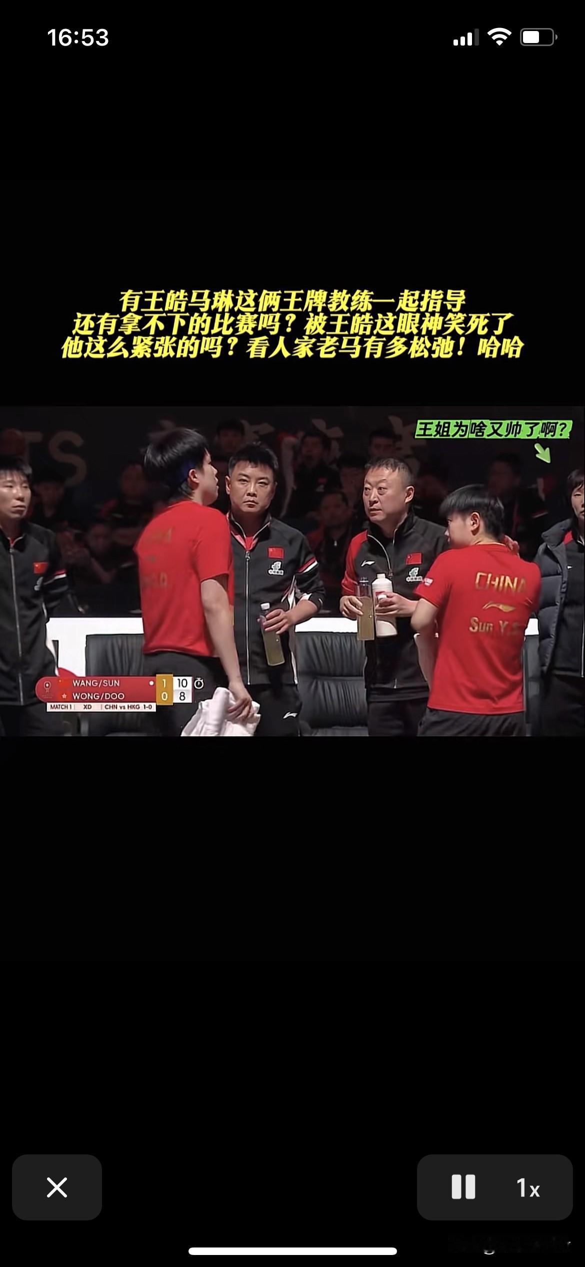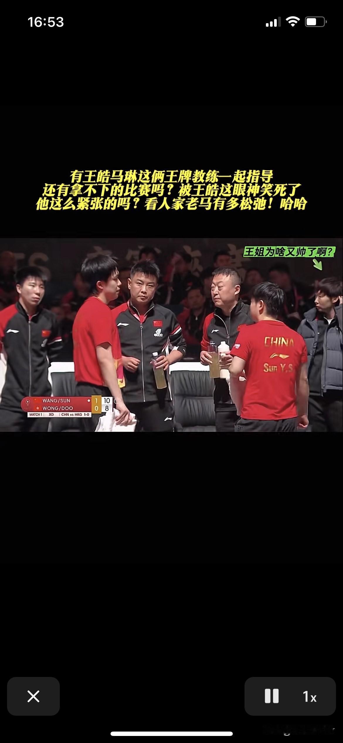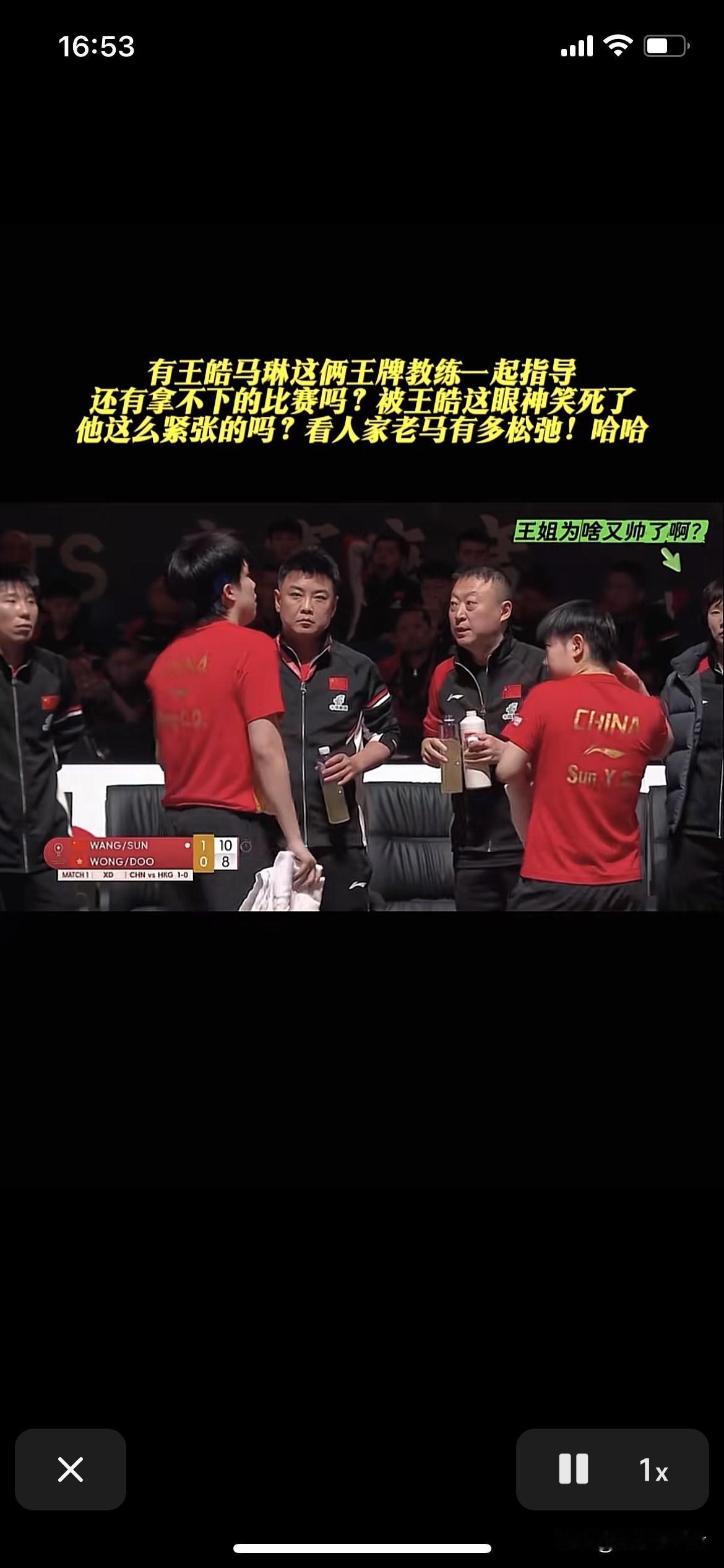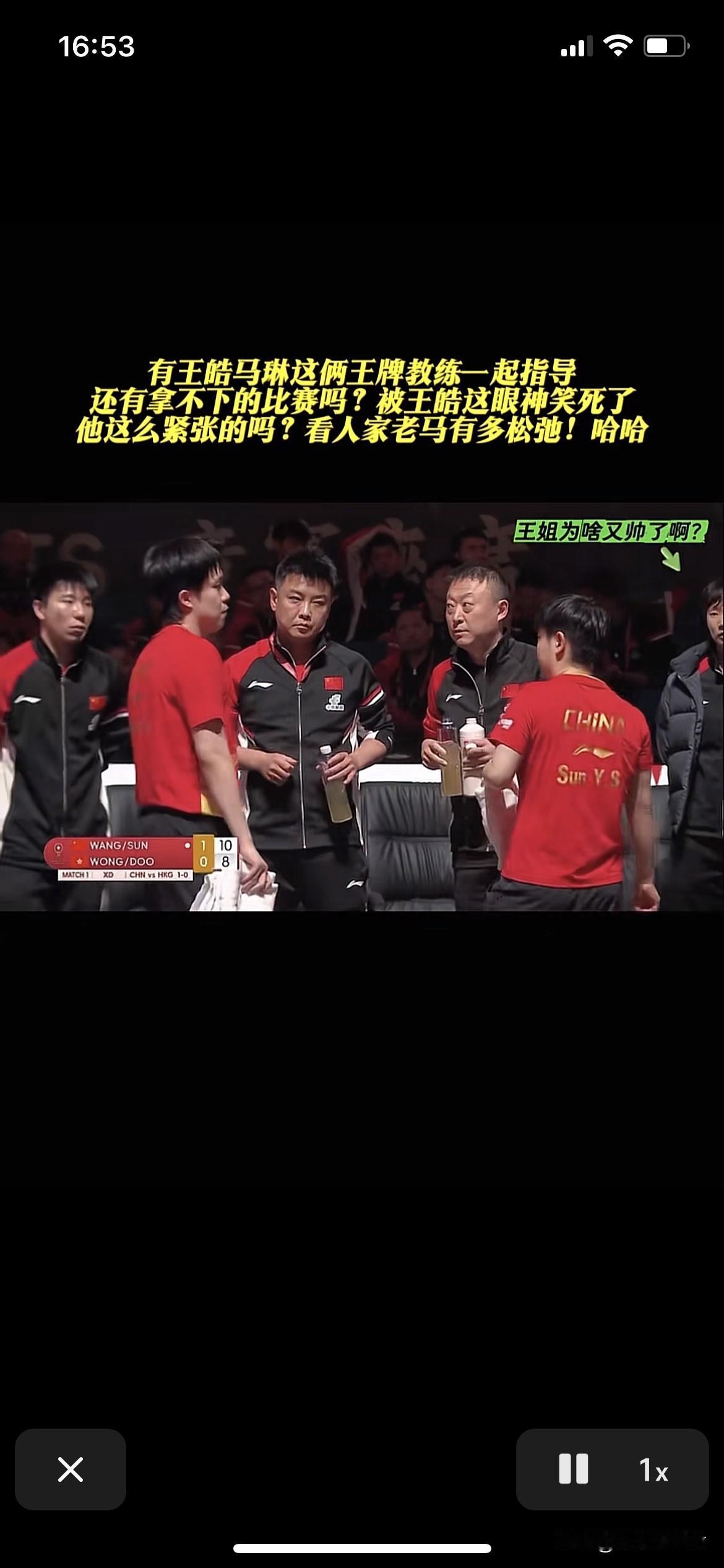 王楚钦孙颖莎暂停时马琳在指导。 马琳一会儿看王楚钦,一会儿看孙颖莎。和他们俩沟通。王皓一言不发。 一会儿后王楚钦在说。孙颖莎马琳在边听边沟通。我们黑龙江的徐瑛彬王曼昱一左一右的站着听。 王皓手里拿一瓶水。没有拧开瓶盖。 马琳手里拿两瓶水。都拧开瓶盖。