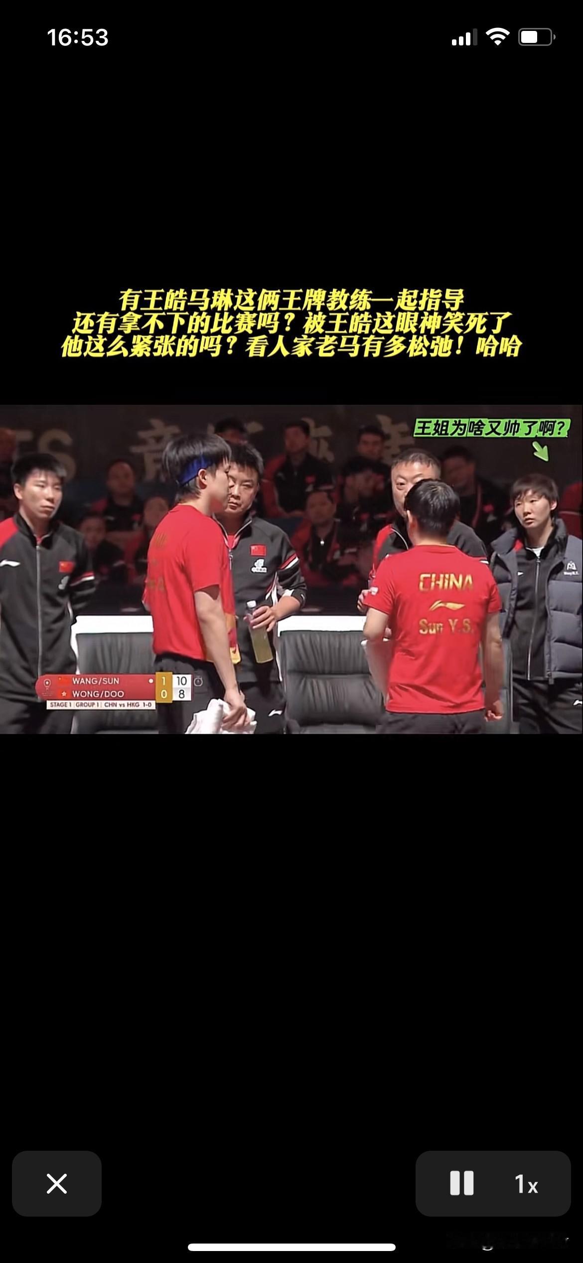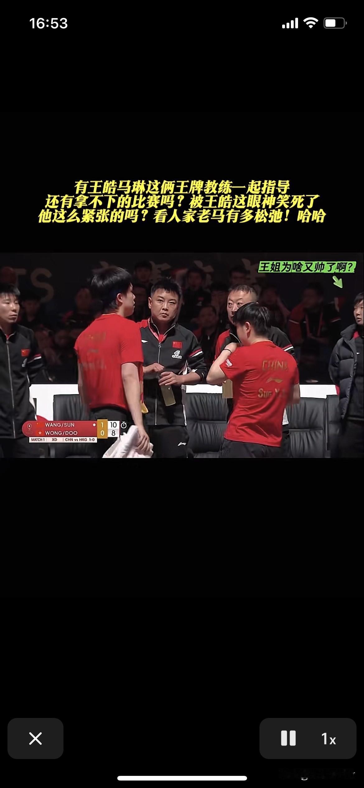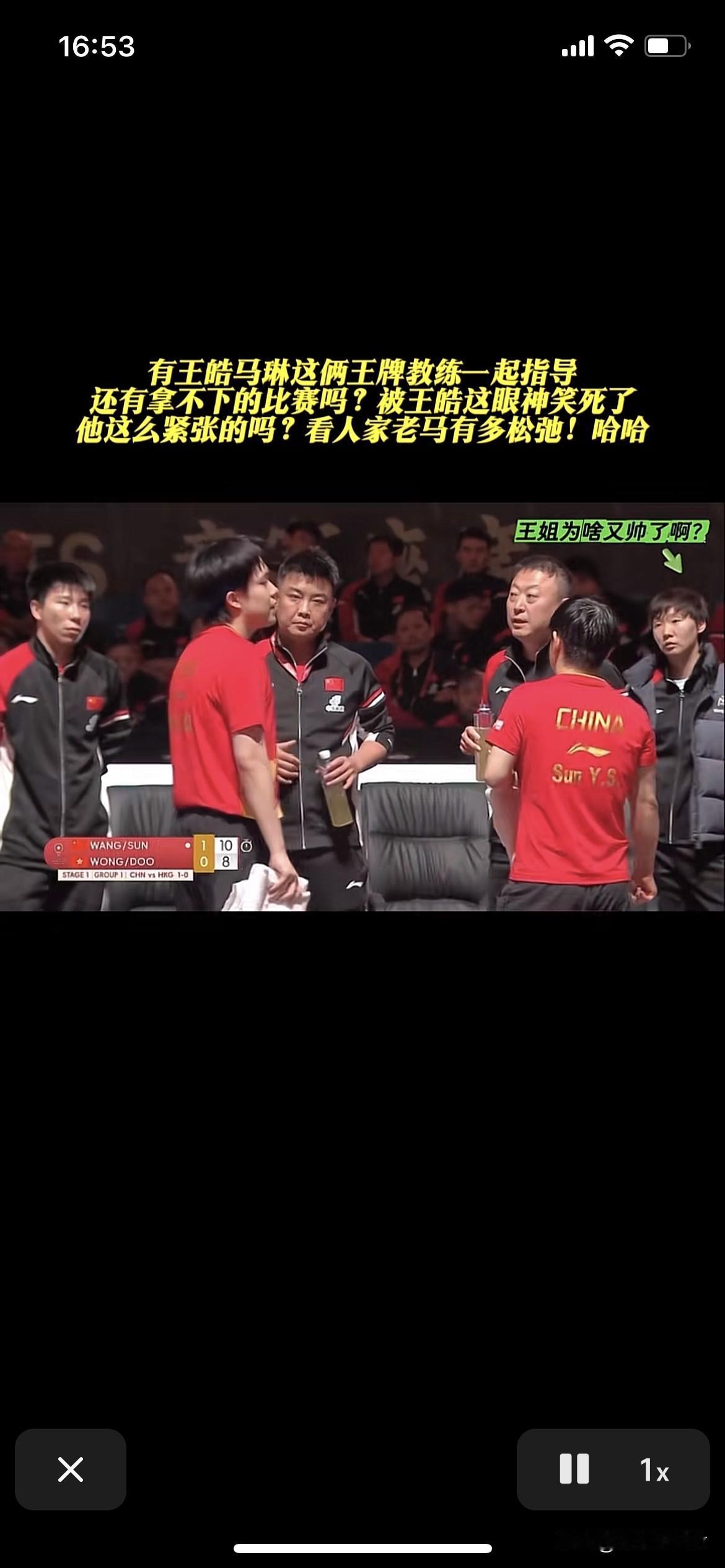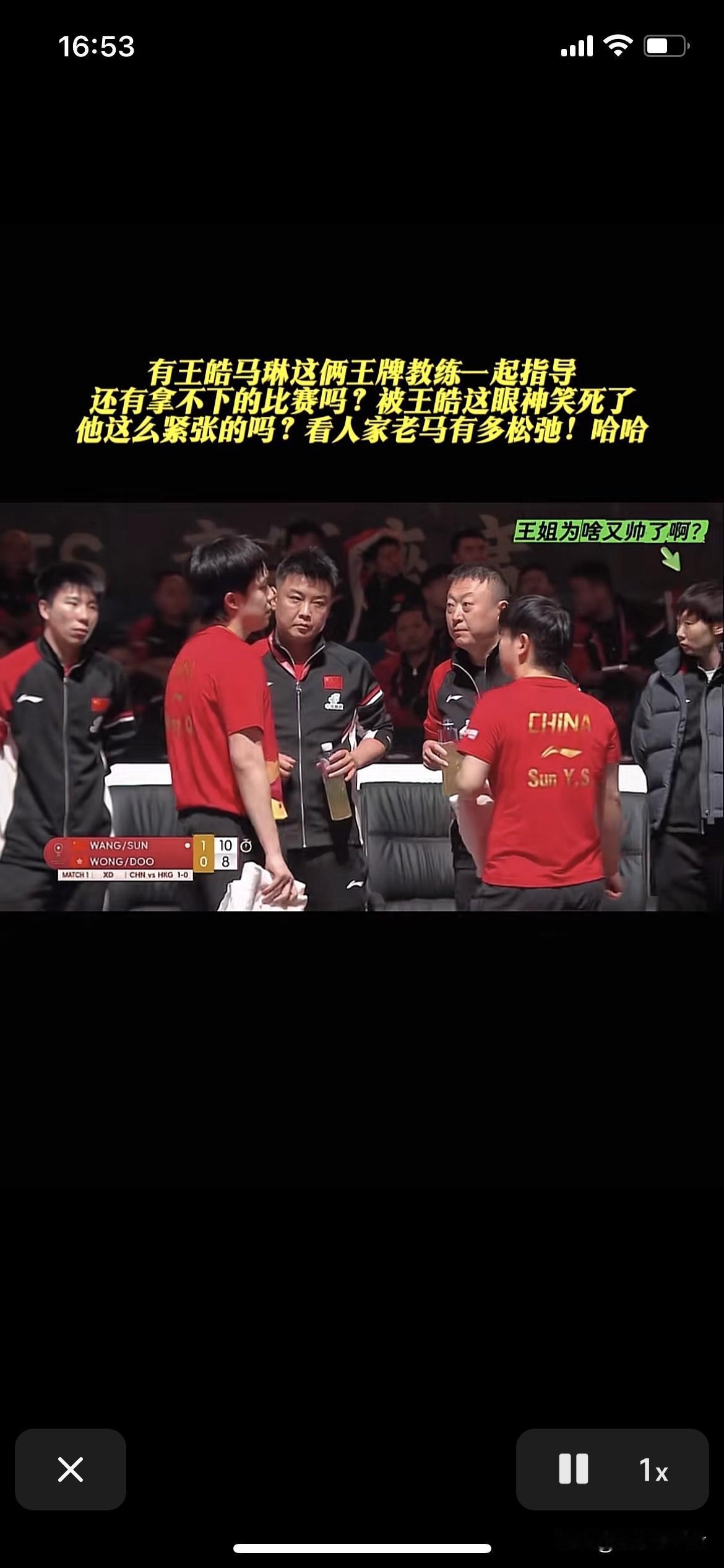 王楚钦孙颖莎暂停时马琳在指导。 马琳一会儿看王楚钦,一会儿看孙颖莎。和他们俩沟通。王皓一言不发。 一会儿后王楚钦在说。孙颖莎马琳在边听边沟通。我们黑龙江的徐瑛彬王曼昱一左一右的站着听。 王皓手里拿一瓶水。没有拧开瓶盖。 马琳手里拿两瓶水。都拧开瓶盖。