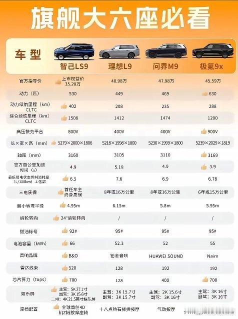 旗舰大六座终极PK,谁才是真香之选?这次广州车展简直是神仙打架!智己LS9、理想L9、问界M9、极氪9X同台竞技但要说性价比之王,还得是智己LS9💰价格直接碾压:上市权益价35.28万,比其他车型立省5-10个W⚡️硬核实力直接拉满:纯电续航402km+综合1508km这才是真·续航王者