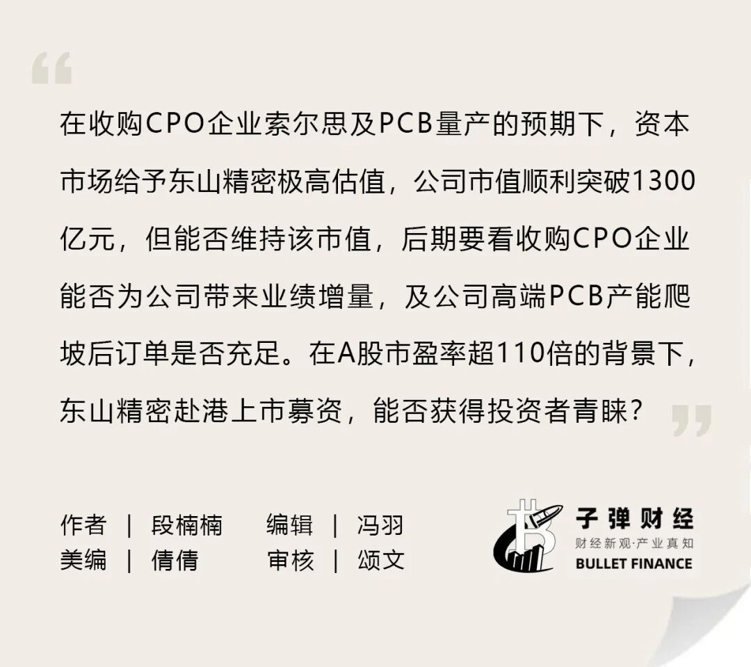 在A股市盈率超110倍的背景下,东山精密赴港上市募资,能否获得投资者青睐顺利登陆港股,「子弹财经」将持续保持关注。