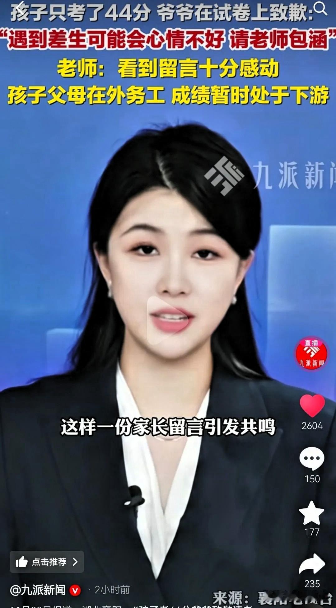 这下好了 上热搜了,全中国人都知道了 湖北一留守儿童只考了44分 爷爷在孙子44分的语文试卷上写下“遇到差生可能会心情不好请老师包含”,没有指责孩子不争气,没有抱怨老师教得不好,只用一句朴实到骨子里的体谅,戳中了无数人的心窝。 有人说这是“家长卑微”,可在我看来,这根本不是妥协,而是教育里最稀缺的清醒。 孩子的父母常年在外打工,爷爷撑起了照顾孙子的重任,他或许不懂什么教育理论,却明白“互相体谅”的道理——老师要面对几十个孩子的课业压力,要批改堆积如山的作业,祖辈带着留守儿童本就力不从心,既要操心生活起居,又要勉强辅导功课,这份不指责、不推诿的包容,比任何满分试卷都更有力量。 反观现在的教育环境,太多人陷入了“分数焦虑”的怪圈:家长为了几分差距鸡飞狗跳,报满各种补习班;老师为了升学率焦头烂额,被迫加码课业; 孩子为了满足期待不堪重负,渐渐失去学习兴趣。可我们忘了,教育的本质是什么?不是流水线生产“高分机器”,而是用爱与尊重滋养孩子的成长,教会他们做人的道理。 这个考了44分的孩子,或许暂时在学习上落后,但爷爷用行动教他的“体谅他人”“尊重师长”,却是比知识更珍贵的人生财富。邱老师被爷爷的善意打动,这份双向的理解,正是家校关系该有的样子——老师不苛责,家长不挑剔,才能给孩子营造一个松弛的成长环境。 教育从来不是单方面的拉扯,而是老师、家长、孩子的三方同行。少一点“分数至上”的执念,多一点“互相包容”的格局,孩子才能在爱与理解中慢慢成长,这才是对他们最好的负责。