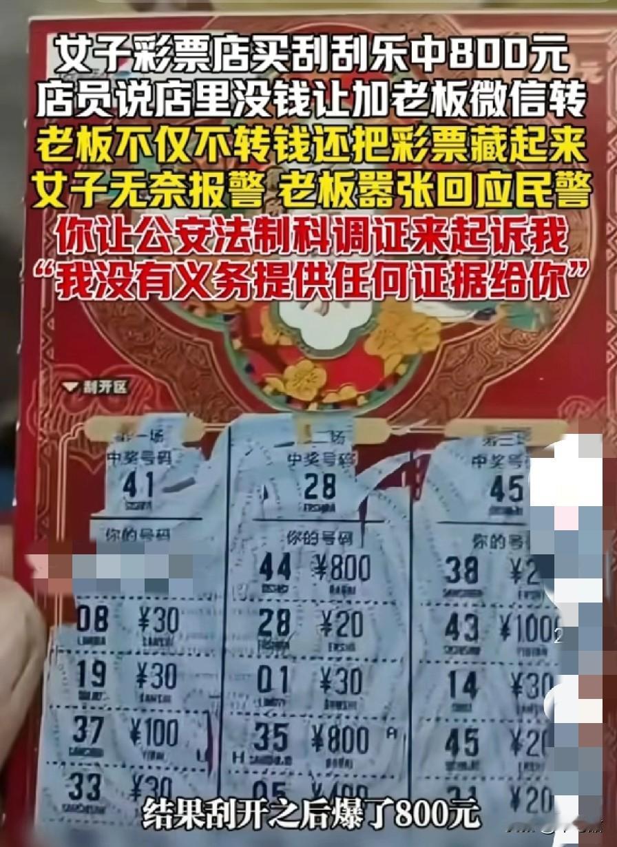 还以为中了800万呢,没想到彩票店,一顾客中了800块,店家都不给。 近日在山西,一女子买了机选10注后,又买了一张刮刮乐,没成想中了800元,叫店家兑换的时候,店家说没这么多现金给她,就让顾客加了老板的微信。 结果等了很久也没见老板转账过来,老板来了以后,以看彩票为由,甚至还收走了顾客刮刮乐,就不承认中奖一事了。 女子见老板这么波皮无赖,立即打电话报警,可老板见到民警来了,一点不带怕的,甚至叫嚣民警,我没义务提供你们想要的证据,有本事去起诉他。 民警也没见到这么无赖的人,自己还是老板,按理彩票店遇到中奖的,都会有专门的地方去兑奖,这也不需要老板垫付啊,老板为什么这么介意中奖的事,好像这笔钱由他来承担一样,不科学啊。 因为眼下已经没有可以证明的证据,彩票也被老板收走了,民警也不能强制叫老板拿出来,可这也太荒唐了,只能提醒各位,买彩票拍个照存个档,遇到这种蛮横不讲理的店主,也只能自认倒霉了。 (图片来自网络视频)