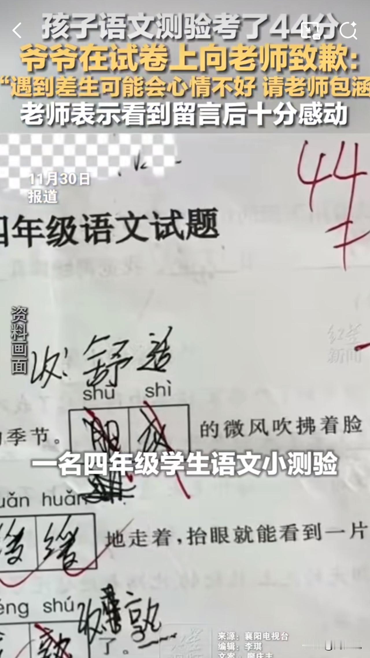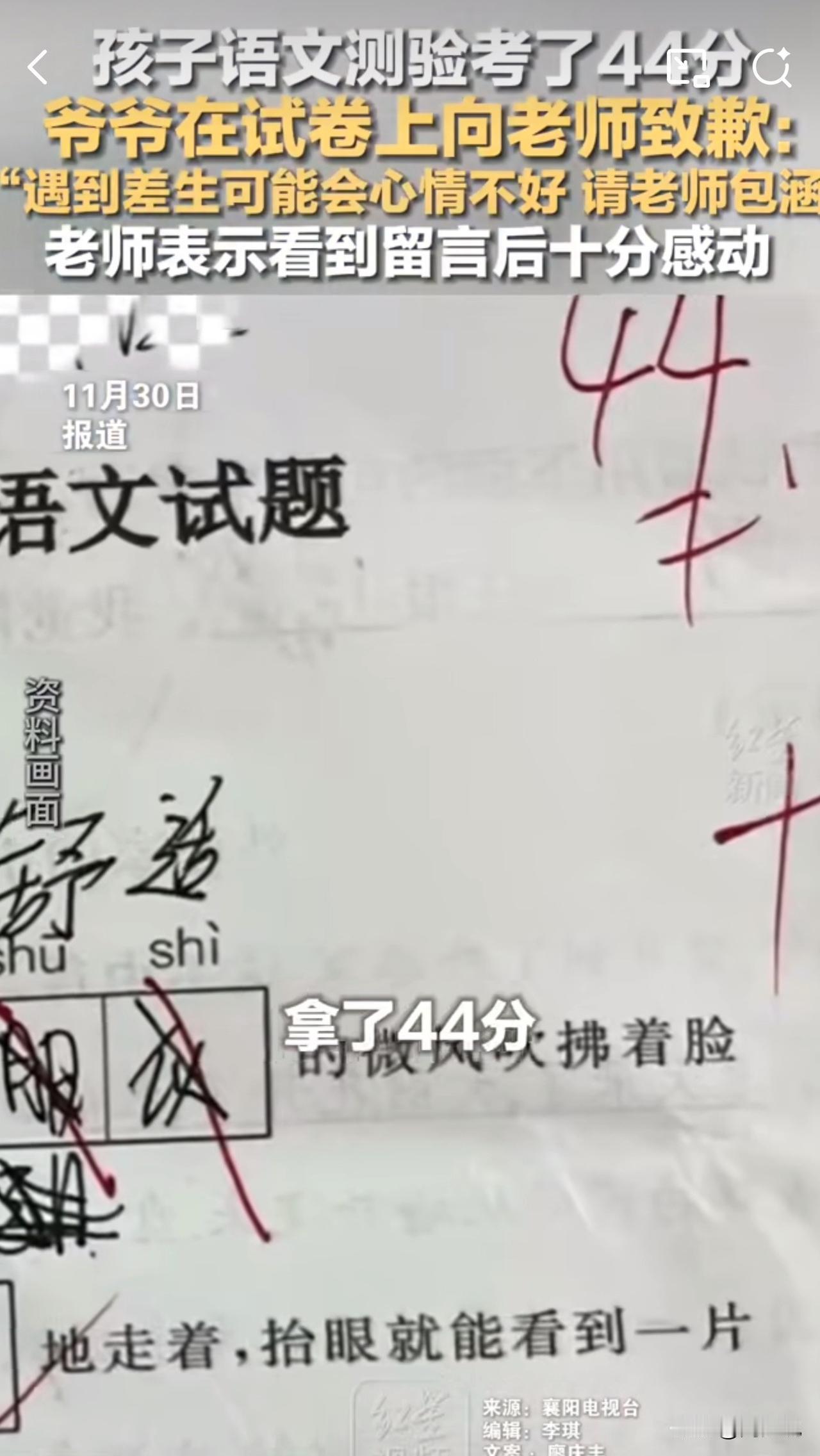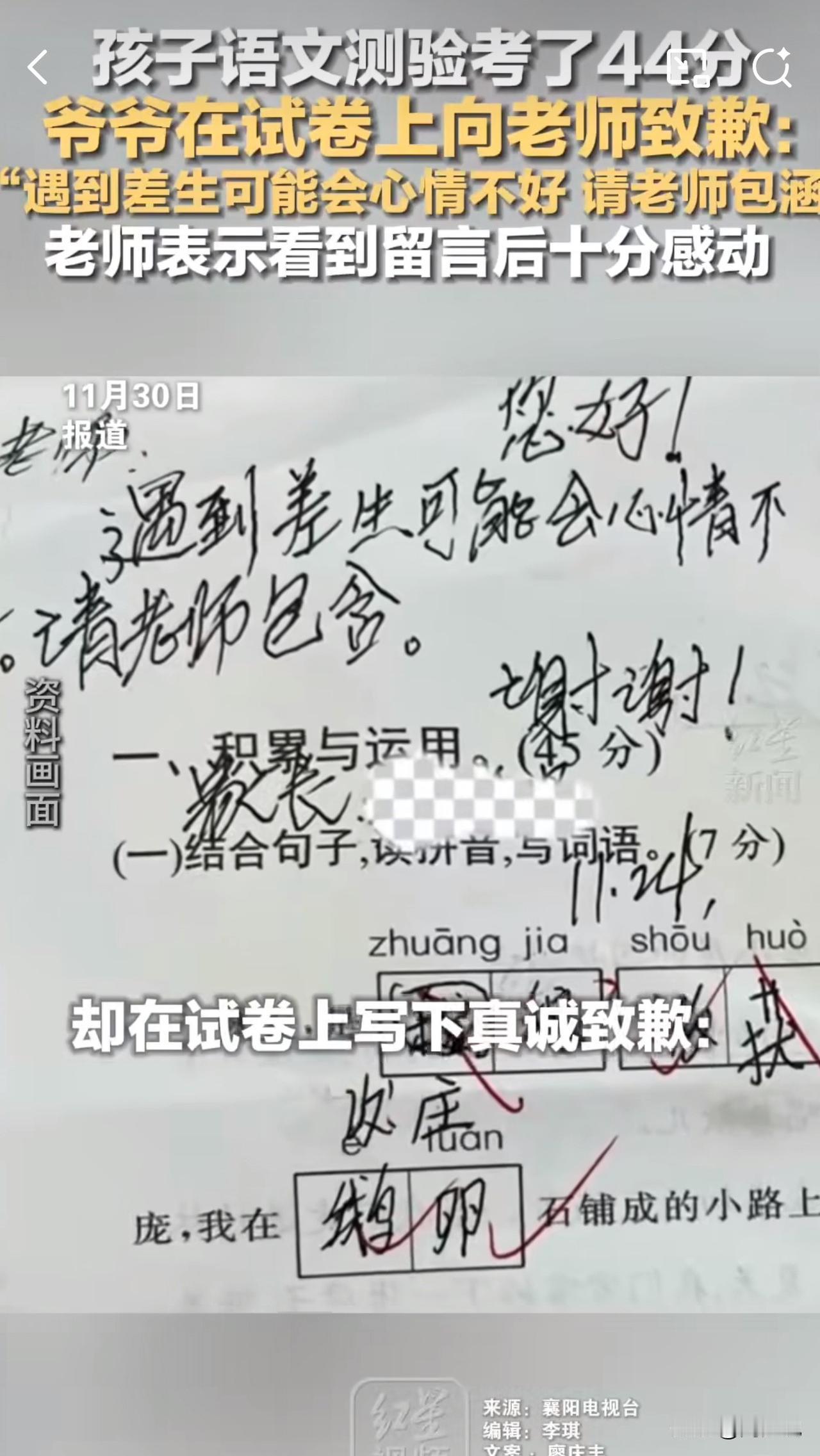 #MCN双量进阶计划#“孩子考44分,爷爷试卷上的留言火了!”湖北襄阳,一名四年级学生语文测验仅考44分,试卷上却出现了一段让老师热泪盈眶的留言。孩子爷爷亲笔写道:“老师您好!遇到差生可能会心情不好,请老师包涵,谢谢!” 据悉,孩子父母常年在外务工,由爷爷照料,成绩暂时处于下游。这份朴实无华的致歉,没有指责孩子,没有抱怨老师,反而满是对老师的体谅与真诚,让阅卷老师倍感温暖。 事情曝光后,众多网友议论纷纷。有网友说:“这爷爷太通情达理了!教育需要这样的家校互谅”! 也有网友称:“隔着屏幕都觉得暖心,善良的长辈教出来的孩子一定不会差”! 周少想说成绩从来不是衡量孩子的唯一标准,而这份跨越辈分的理解与尊重,正是教育中最动人的底色。爷爷的留言不仅温暖了老师,更诠释了教育的本质,包容与携手同行,这样的教育氛围,才能让每个孩子都在关爱中成长。#寻美三湘# #长沙新朋友#
