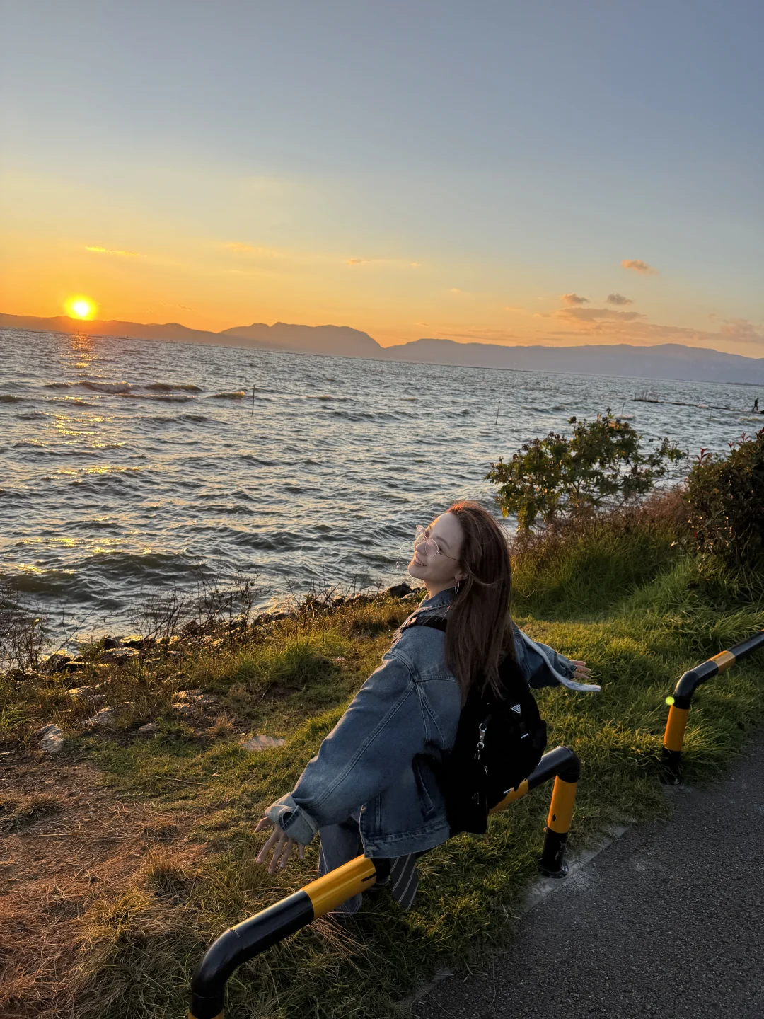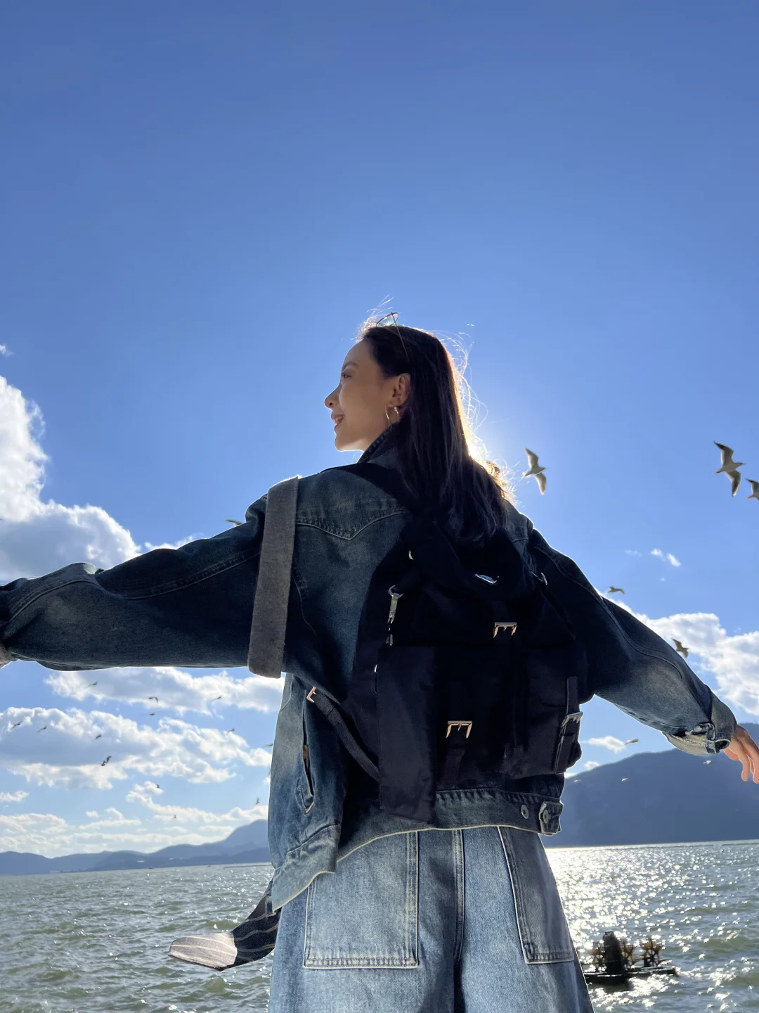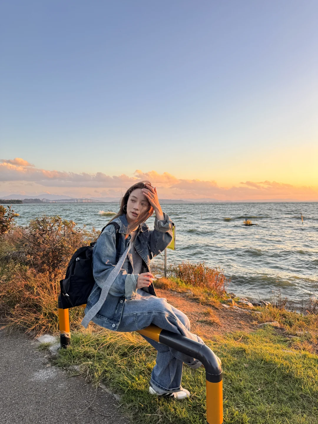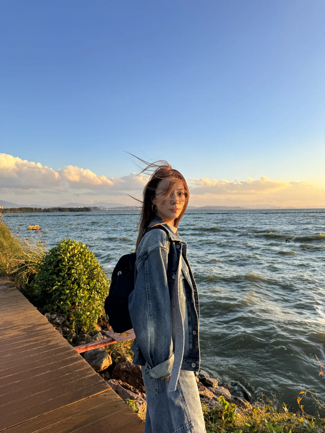 昆明最近的天气太适合Citywalk啦☀️ 海鸥也如约而至 一切都刚刚好 背上我的再生尼龙双肩包 漫步在滇池边上 感受微风轻拂过大地🍃 黄金时刻来到龙山看日落 百搭的Prada Re-Nylon双肩包搭配一身牛仔 简简单单的 是我舒服的状态啦🚶🏻♀️➡️ 我这种长期主义者完全被硬控住~