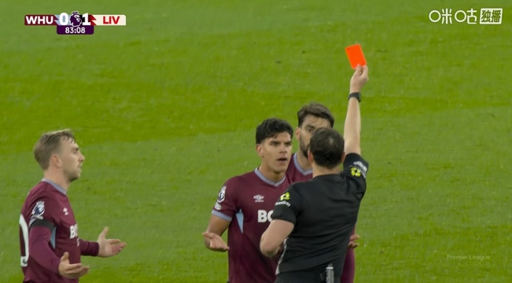 这名牌买了自己或者西汉姆吃红,三个队友加对面阿利松跑来拉都拉不住,堵着裁判要了几分钟,吃红后心满意足地笑着下场