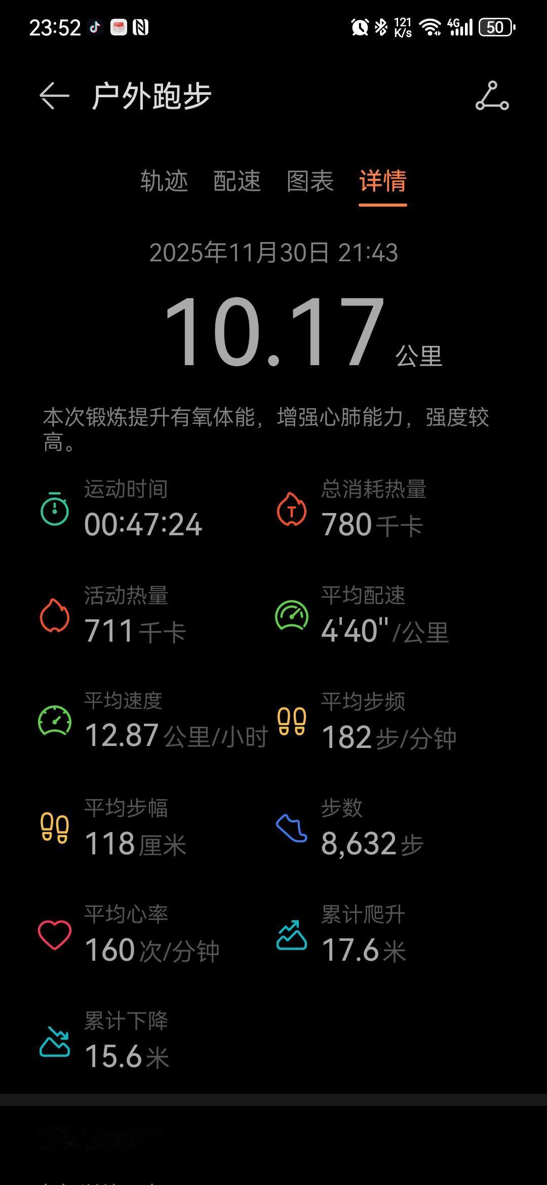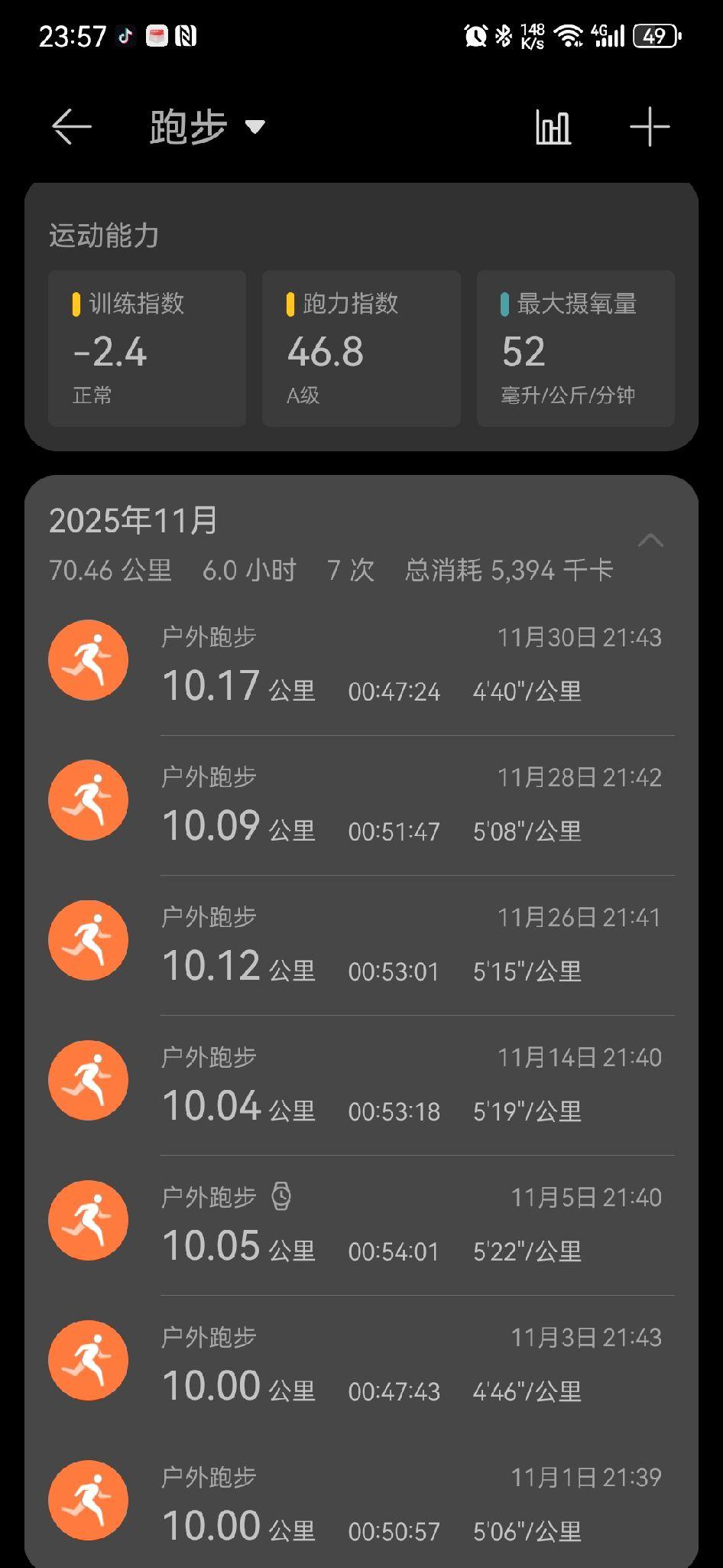 抖音的大神们,我这个配速,能上台面吗? 11月马上就要结束了,这个月感冒了,十几天都没有跑,这个月才跑了70公里,其实今晚想跑一个半马,可每次跑完半马,晚上都会失眠。 索性又跑了个10公里。