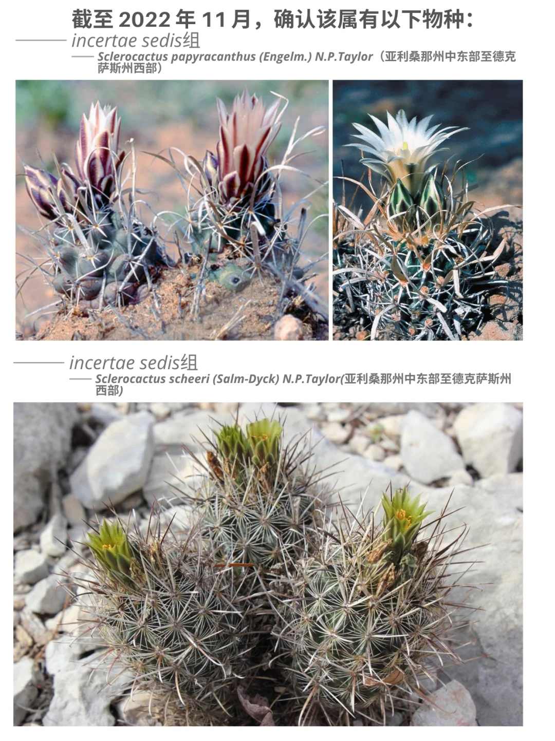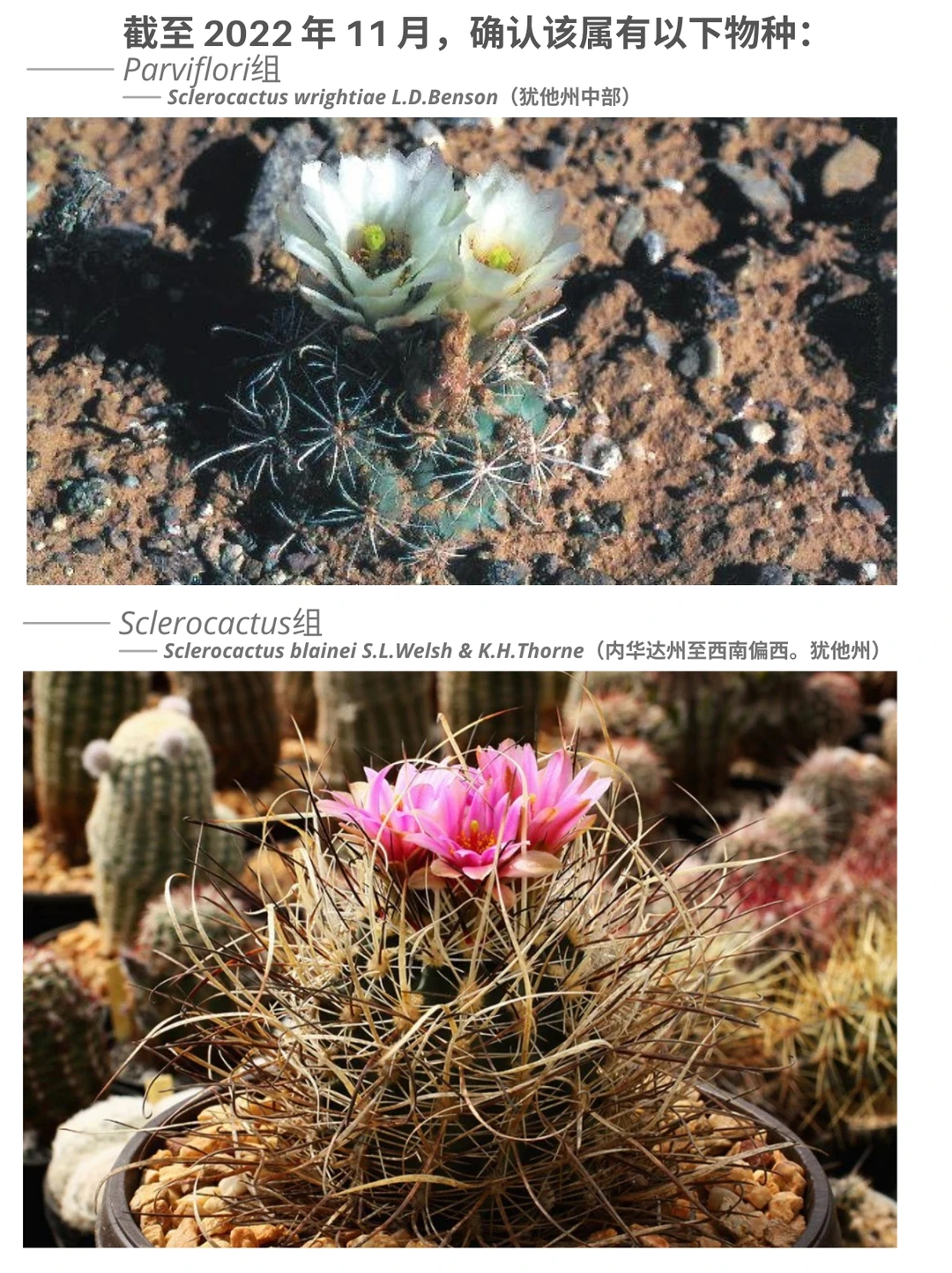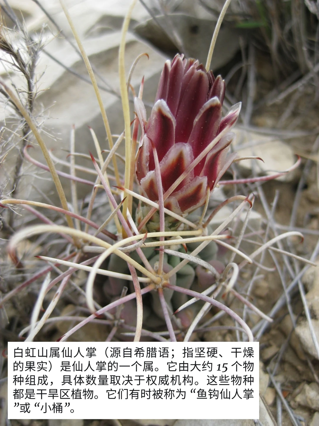 仙人掌科 白虹山属 Sclerocactus 仙人球 墨西哥 卡罗拉多 莫哈维沙漠 沙生植物 白虹山属仙人掌(源自希腊语;指坚硬、干燥的果实)是仙人掌科的一个属。它由大约 15 个物种组成,具体数量取决于权威机构。这些物种都是干旱区植物。它们有时被称为 “鱼钩仙人掌 ”或 “小桶”。 白虹山属仙人掌的形状从卵圆形到长圆柱形不等,茎部坚硬,有小瘤,一般凝聚成棱,多数种类的每个小瘤上至少有一根带钩的刺。少数物种可能没有钩刺。 这些植物生长在海拔较高的沙漠地区,如科罗拉多高原、莫哈维沙漠或大盆地。由于缺乏降雨、夏季炎热、冬季零度以下,它们非常适合在极端条件下生长。 白虹山属仙人掌通常生长在水流不规则的地方,或者可以短时间积水的洼地。它们最常生长在冲沟和河道沿线,那里的水流会使它们的种子聚集并发芽,但奇怪的是,它们也往往生长在山脊上形成洼地的地方,那里可以蓄水一段时间。 该属物种的仙人掌有时会有钩状或弯曲的刺和刺网,这是一种适应能力,可以让植物移动到更有利的位置。这种植物的种子在有水流的地方或积水较多的地方发芽,在山洪暴发时,钩状的刺可以让植物被水流中的杂物缠住,连根拔起并被带到积水较多的地方。栖息地中很大一部分植物的茎部都有被水流冲刷过的痕迹,这些痕迹已经愈合,并在洪水冲刷过的地方侧身生长。这些植物的栖息地非常干旱,这些植物已经适应了利用水的流动,将其自身集中在可能有水的地方。