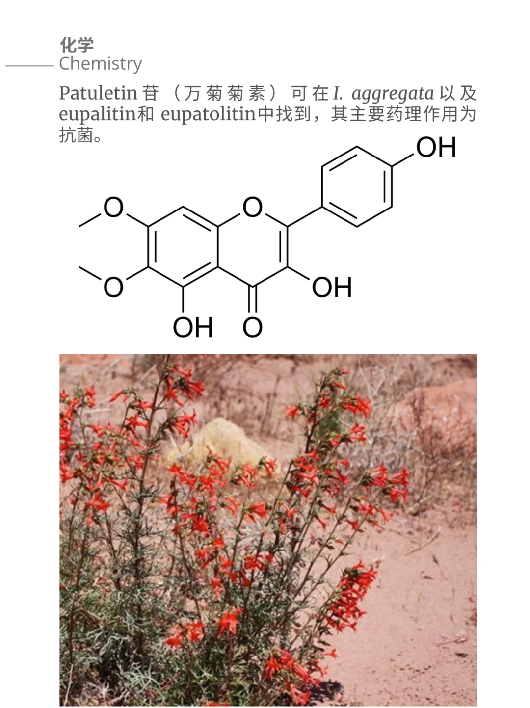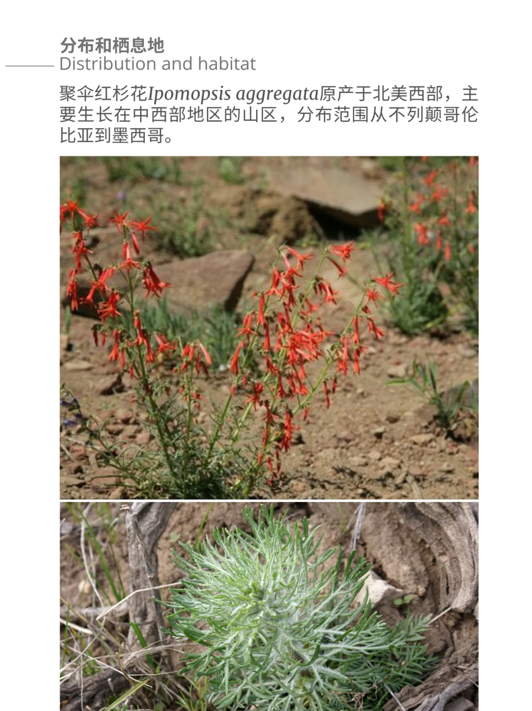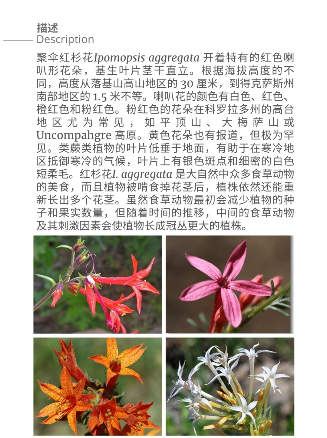聚伞红杉花Ipomopsis aggregata 开着特有的红色喇叭形花朵,基生叶片茎干直立。根据海拔高度的不同,高度从落基山高山地区的 30 厘米,到得克萨斯州南部地区的 1.5 米不等。喇叭花的颜色有白色、红色、橙红色和粉红色。粉红色的花朵在科罗拉多州的高台地区尤为常见,如平顶山、大梅萨山或 Uncompahgre 高原。黄色花朵也有报道,但极为罕见。类蕨类植物的叶片低垂于地面,有助于在寒冷地区抵御寒冷的气候,叶片上有银色斑点和细密的白色短柔毛。红杉花I. aggregata 是大自然中众多食草动物的美食,而且植物被啃食掉花茎后,植株依然还能重新长出多个花茎。虽然食草动物最初会减少植物的种子和果实数量,但随着时间的推移,中间的食草动物及其刺激因素会使植物长成冠丛更大的植株。