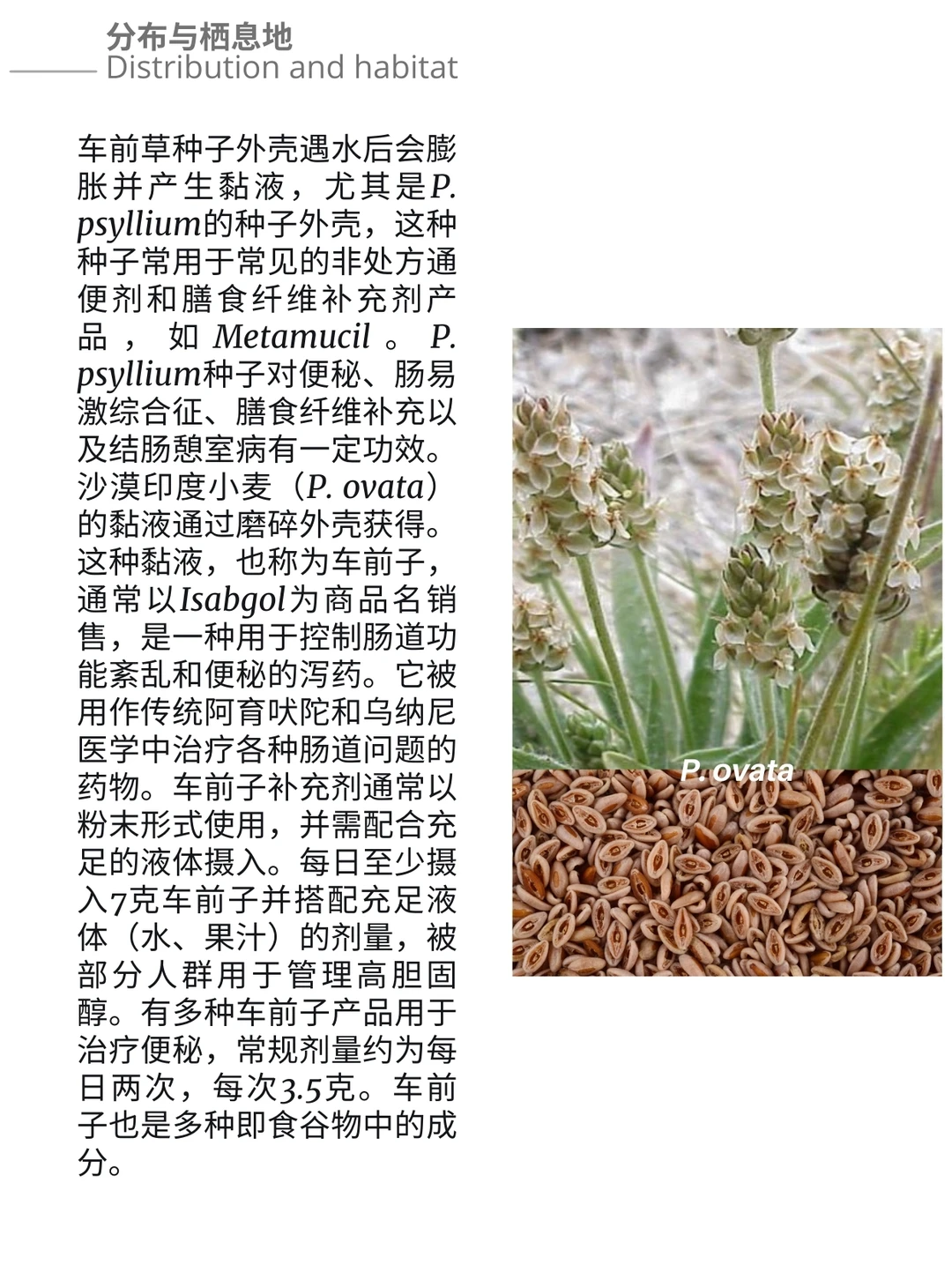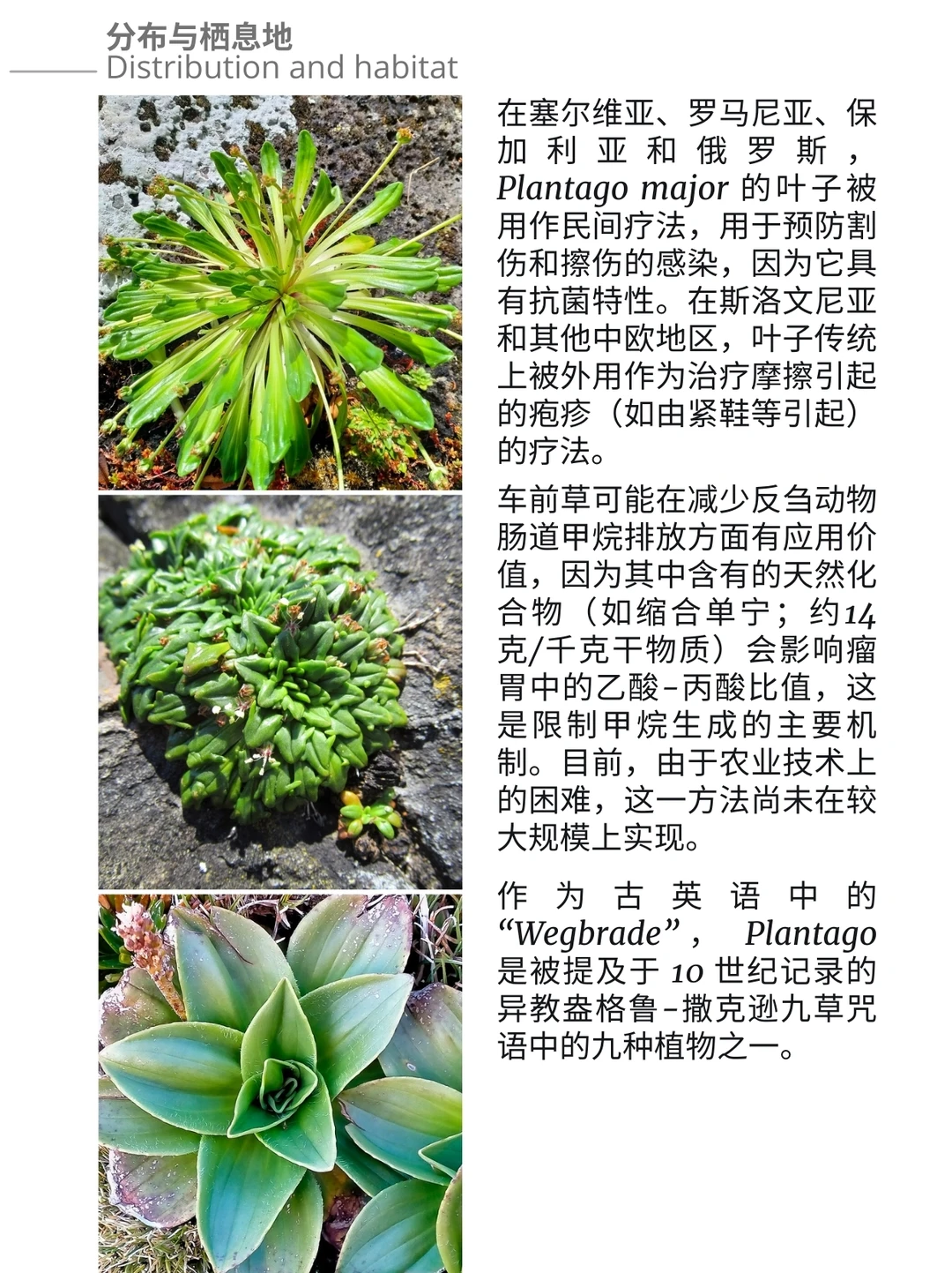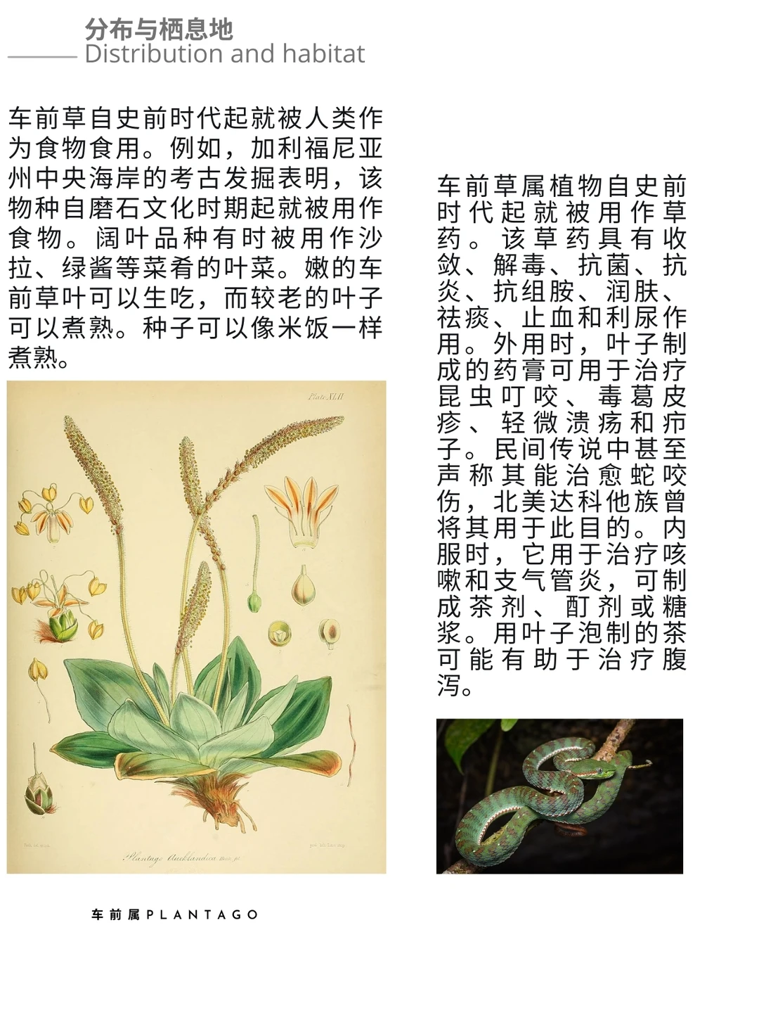 车前草属植物自史前时代起就被用作草药。该草药具有收敛、解毒、抗菌、抗炎、抗组胺、润肤、祛痰、止血和利尿作用。外用时,叶子制成的药膏可用于治疗昆虫叮咬、毒葛皮疹、轻微溃疡和疖子。民间传说中甚至声称其能治愈蛇咬伤,北美达科他族曾将其用于此目的。内服时,它用于治疗咳嗽和支气管炎,可制成茶剂、酊剂或糖浆。用叶子泡制的茶可能有助于治疗腹泻。