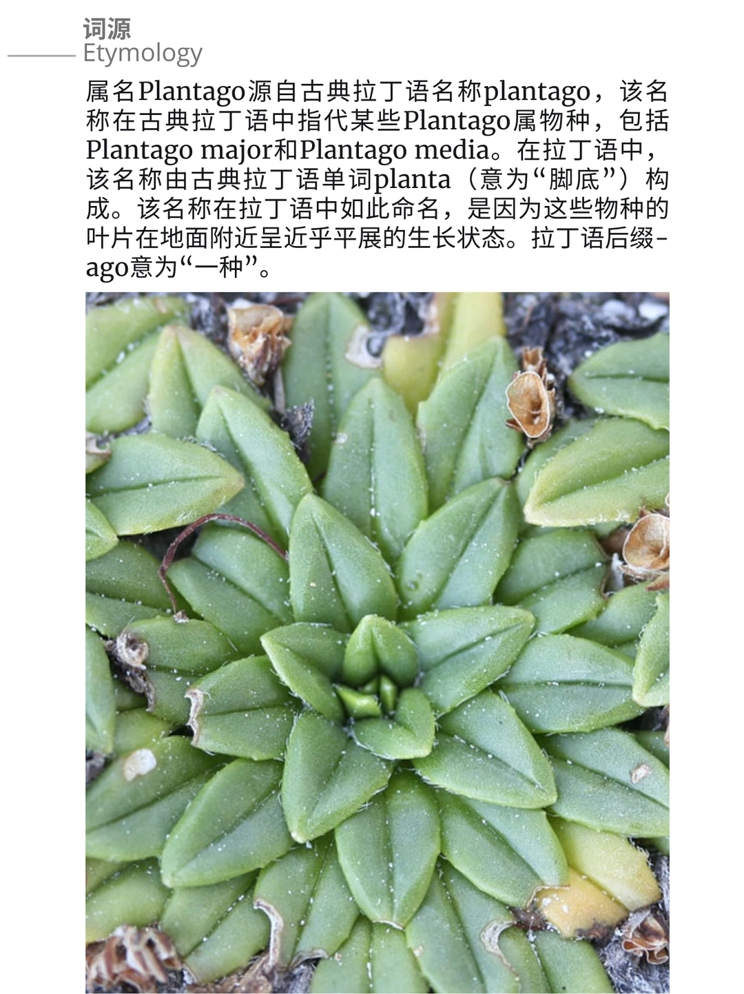 属名Plantago源自古典拉丁语名称plantago,该名称在古典拉丁语中指代某些Plantago属物种,包括Plantago major和Plantago media。在拉丁语中,该名称由古典拉丁语单词planta(意为“脚底”)构成。该名称在拉丁语中如此命名,是因为这些物种的叶片在地面附近呈近乎平展的生长状态。拉丁语后缀-ago意为“一种”。