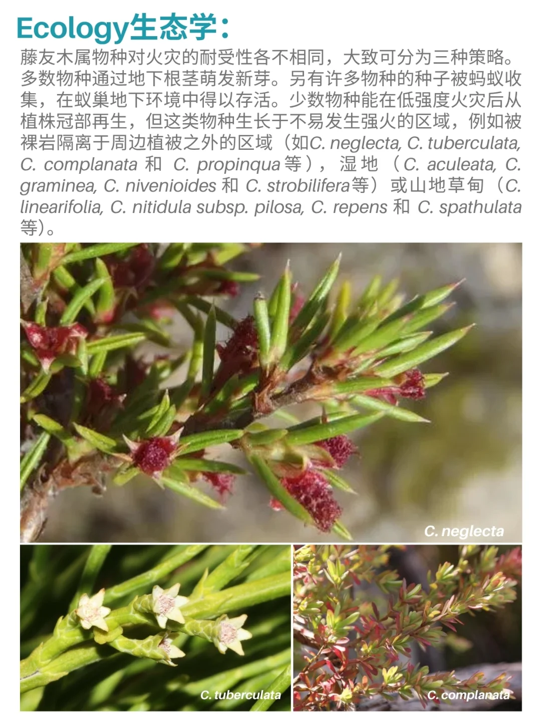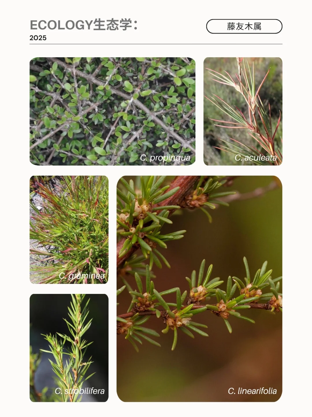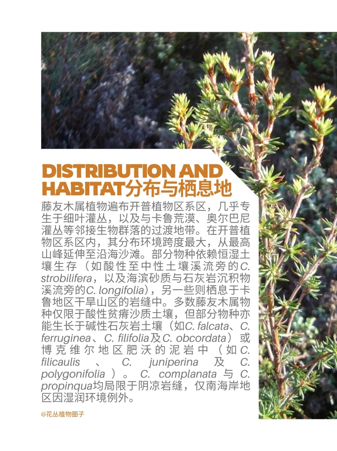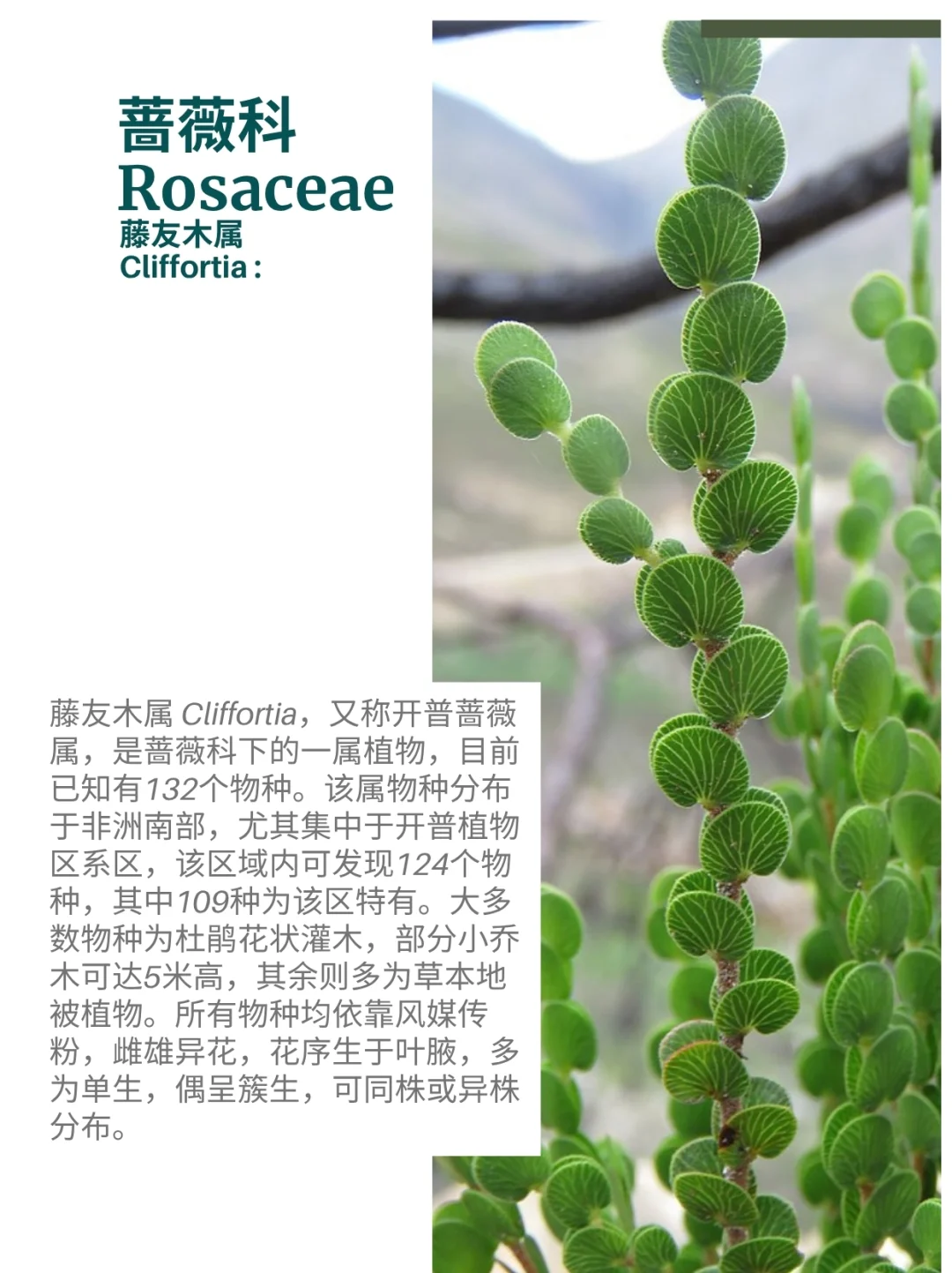 蔷薇科 藤友木属 Cliffortia 开普蔷薇 非洲南部 开普 灌木 花园植物 山野草 植物科普 藤友木属 Cliffortia,又称开普蔷薇属,是蔷薇科Rosaceae藤友木属Cliffortia下的植物,目前已知有132个物种。该属物种分布于非洲南部,尤其集中于开普植物区系区,该区域内可发现124个物种,其中109种为该区特有。大多数物种为杜鹃花状灌木,部分小乔木可达5米高,其余则多为草本地被植物。所有物种均依靠风媒传粉,雌雄异花,花序生于叶腋,多为单生,偶呈簇生,可同株或异株分布。