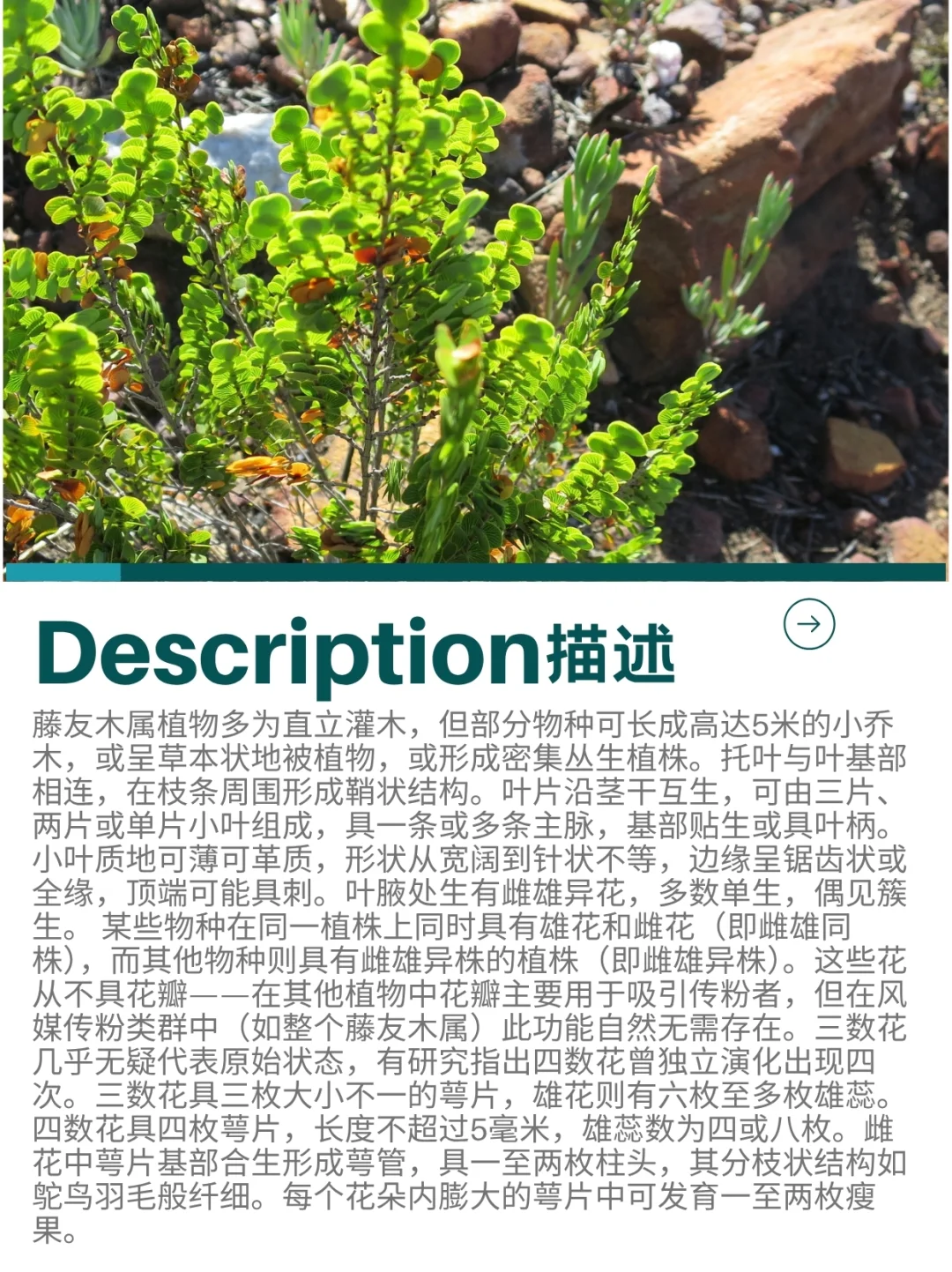 藤友木属植物多为直立灌木,但部分物种可长成高达5米的小乔木,或呈草本状地被植物,或形成密集丛生植株。托叶与叶基部相连,在枝条周围形成鞘状结构。叶片沿茎干互生,可由三片、两片或单片小叶组成,具一条或多条主脉,基部贴生或具叶柄。小叶质地可薄可革质,形状从宽阔到针状不等,边缘呈锯齿状或全缘,顶端可能具刺。叶腋处生有雌雄异花,多数单生,偶见簇生。 某些物种在同一植株上同时具有雄花和雌花(即雌雄同株),而其他物种则具有雌雄异株的植株(即雌雄异株)。这些花从不具花瓣——在其他植物中花瓣主要用于吸引传粉者,但在风媒传粉类群中(如整个藤友木属)此功能自然无需存在。三数花几乎无疑代表原始状态,有研究指出四数花曾独立演化出现四次。三数花具三枚大小不一的萼片,雄花则有六枚至多枚雄蕊。四数花具四枚萼片,长度不超过5毫米,雄蕊数为四或八枚。雌花中萼片基部合生形成萼管,具一至两枚柱头,其分枝状结构如鸵鸟羽毛般纤细。每个花朵内膨大的萼片中可发育一至两枚瘦果。