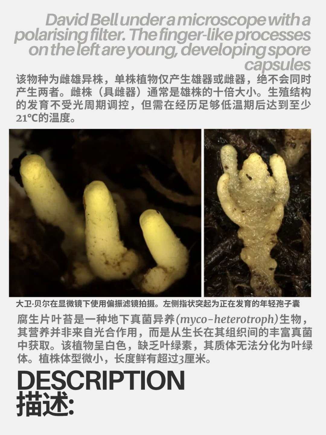 腐生片叶苔是一种地下真菌异养(myco-heterotroph)生物,其营养并非来自光合作用,而是从生长在其组织间的丰富真菌中获取。该植物呈白色,缺乏叶绿素,其质体无法分化为叶绿体。植株体型微小,长度鲜有超过3厘米。