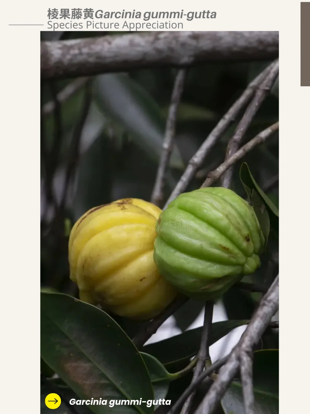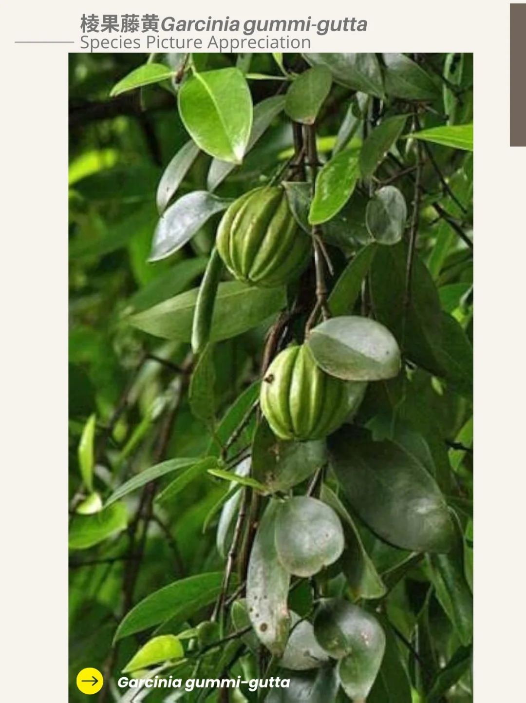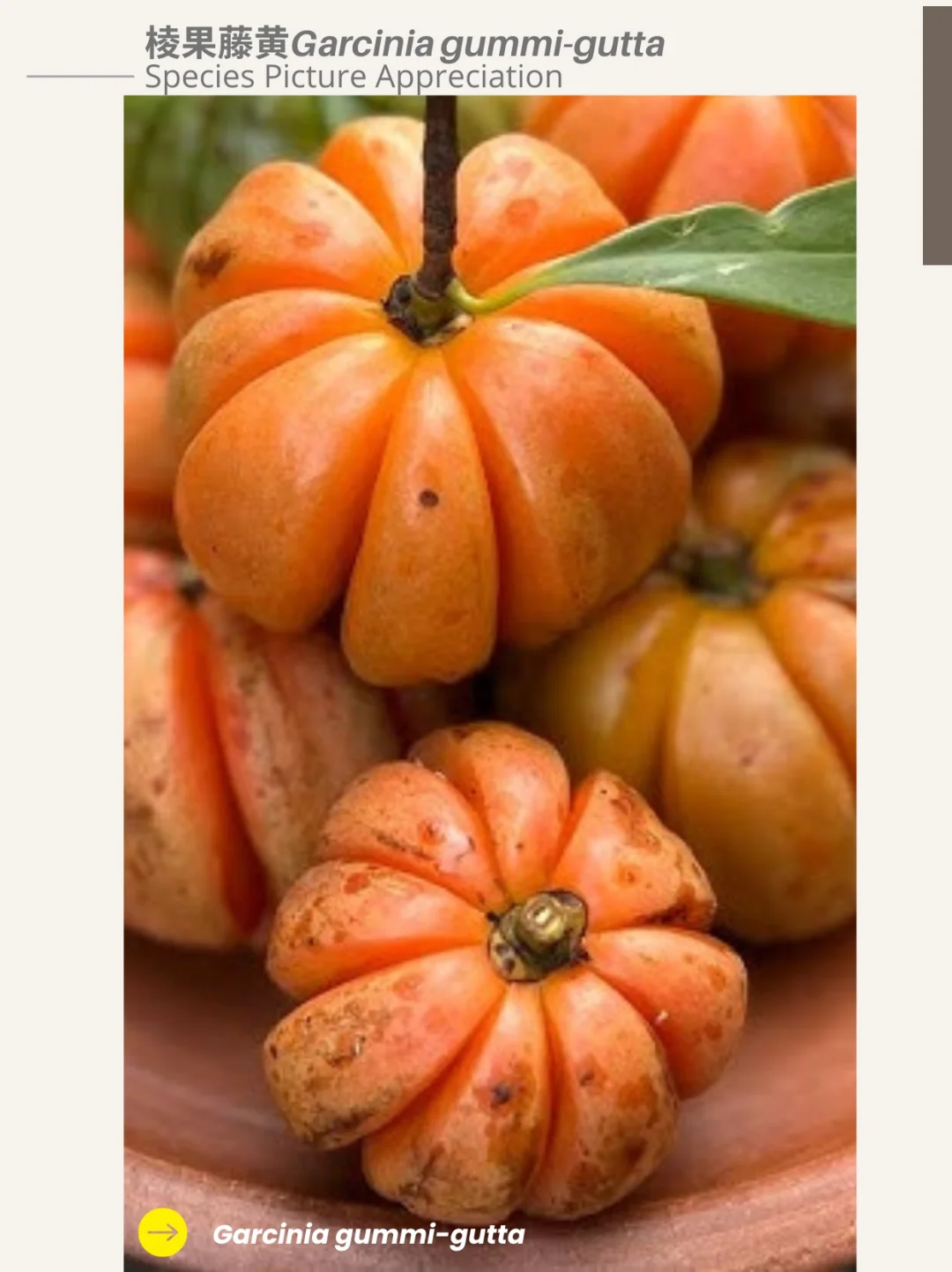 棱果藤黄 竹子科 藤黄属 藤黄 东南亚 热带植物 酸咖喱 可食用植物 植物 闯入我生活的新奇植物 棱果藤黄Garcinia gummi-gutta,是一种原产于南亚及东南亚的热带山竹子科Clusiaceae藤黄属植物。其常见名称包括藤黄果(旧学名)、斑纹莓及马拉巴尔罗望子。果实形似小型南瓜,呈绿色至淡黄色。尽管该植物因宣称具有减肥功效而受到媒体广泛关注,但含有其果实提取物的商业制剂Hydroxycut被报道存在肝毒性风险,且临床证据表明其对减肥并无显著效果。
