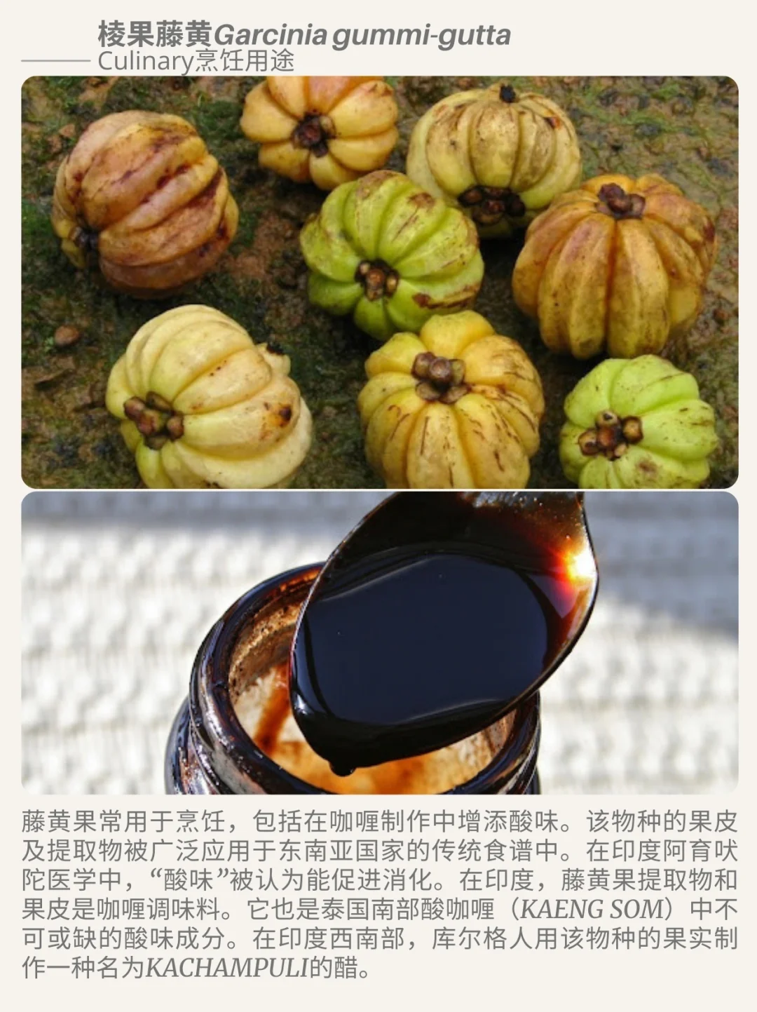 藤黄果常用于烹饪,包括在咖喱制作中增添酸味。该物种的果皮及提取物被广泛应用于东南亚国家的传统食谱中。在印度阿育吠陀医学中,“酸味”被认为能促进消化。在印度,藤黄果提取物和果皮是咖喱调味料。它也是泰国南部酸咖喱(kaeng som)中不可或缺的酸味成分。在印度西南部,库尔格人用该物种的果实制作一种名为kachampuli的醋。