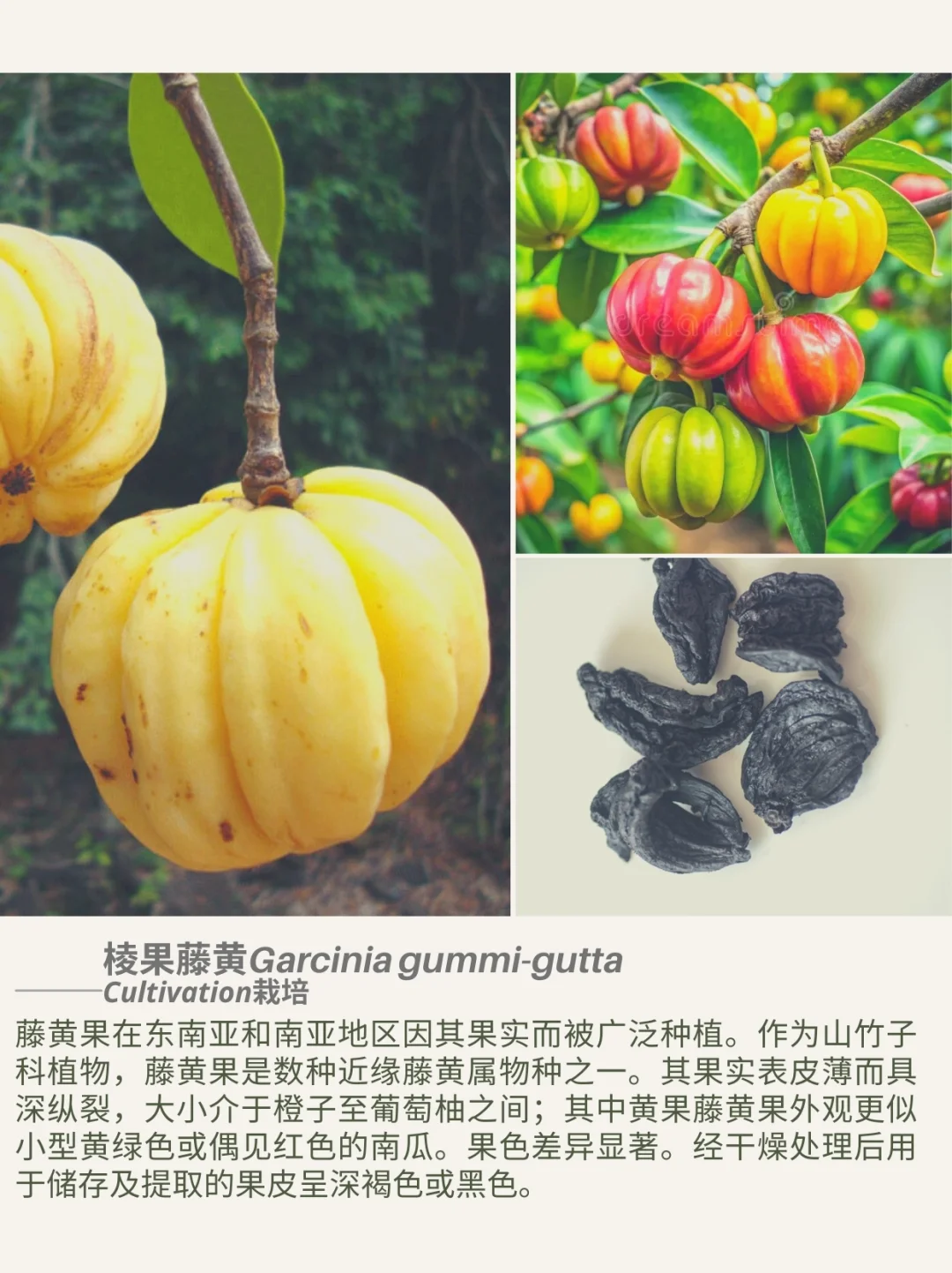 藤黄果在东南亚和南亚地区因其果实而被广泛种植。作为山竹子科植物,藤黄果是数种近缘藤黄属物种之一。其果实表皮薄而具深纵裂,大小介于橙子至葡萄柚之间;其中黄果藤黄果外观更似小型黄绿色或偶见红色的南瓜。果色差异显著。经干燥处理后用于储存及提取的果皮呈深褐色或黑色。